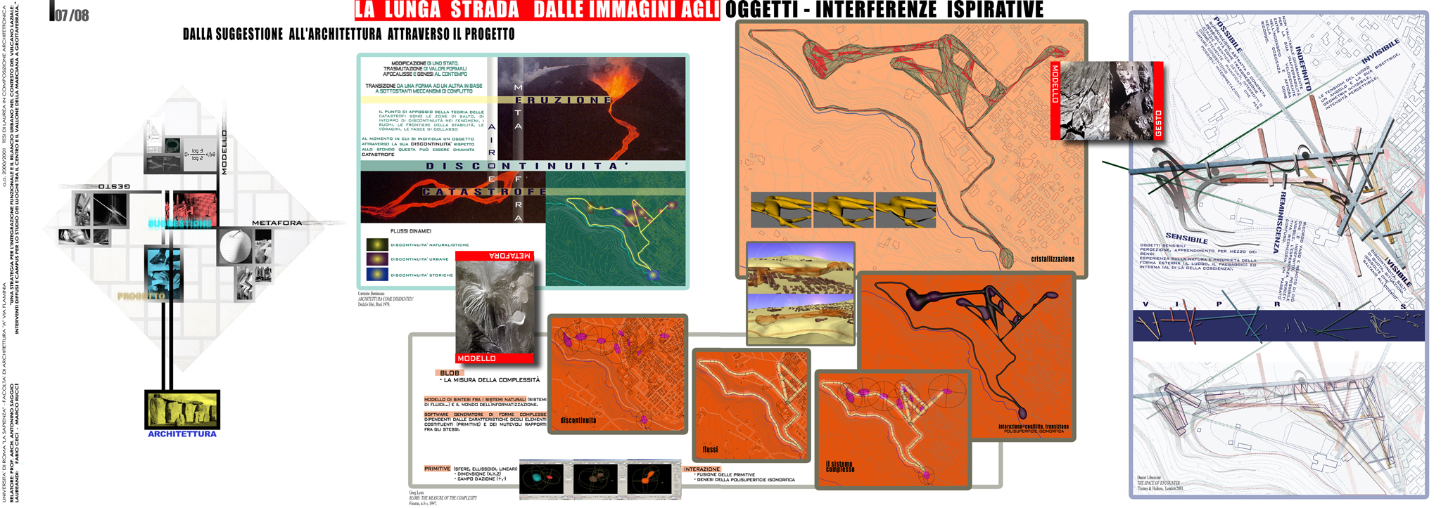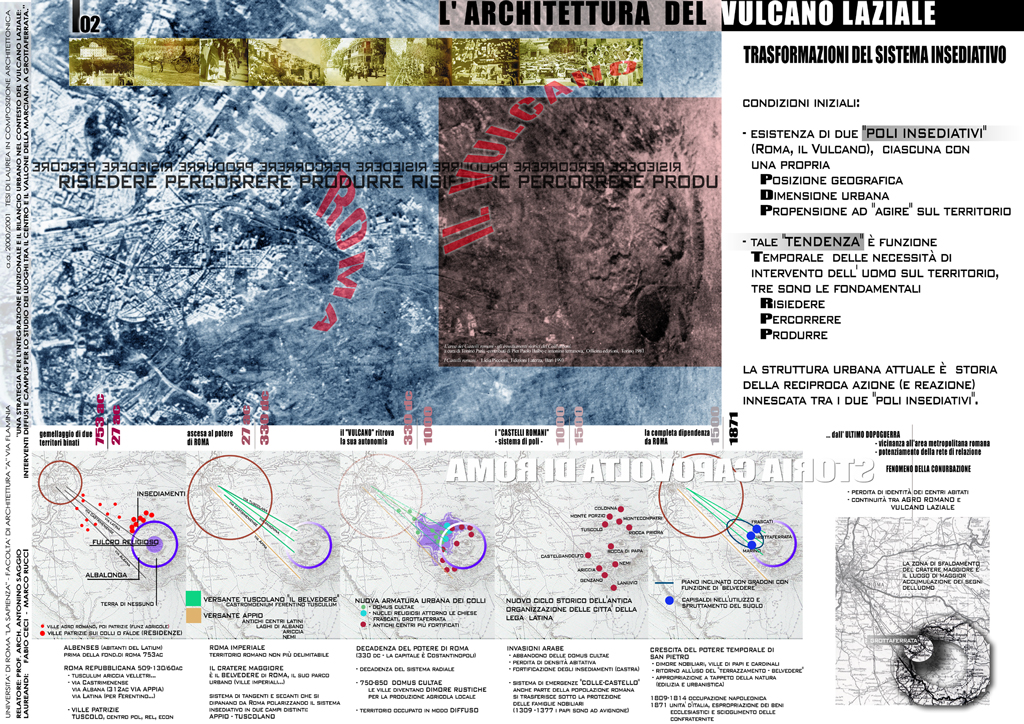 Partendo dall'analisi delle specificità storiche, urbanistiche e paesaggistiche del vulcano laziale e attraverso una attiva collaborazione con l'autorità comunale, il progetto propone una strategia di rilancio urbano che tiene conto della prossimità del comune con la capitale e con le altre cittadine dei colli. L’innovativo programma d'uso si concentra su un complesso da destinare a campus di ricerca per lo studio del vulcano laziale. Il campus si articola in un misto funzioni sia in rapporto a una più vasta strategia di recupero di Grottaferrata sia in relazione allo svolgersi delle specifiche attività di ricerca che in esso si svolgono. Nella creazione degli spazi urbani e dei volumi edilizi del progetto la stessa movimentata orografia del sito viene reinterpreta con procedimenti analogici rispetto al magmatico formarsi del paesaggio vulcanico circostante utilizzando modificatori e attrattori permessi da programmi informatici di simulazione. Il progetto urbano nasce di conseguenza seguendo gli andamenti che seguirebbe una ipotetica colata lavica indirizzata però secondo i punti caldi, le adiacenze e le direttrici derivate dalla specifica situazione urbana.
