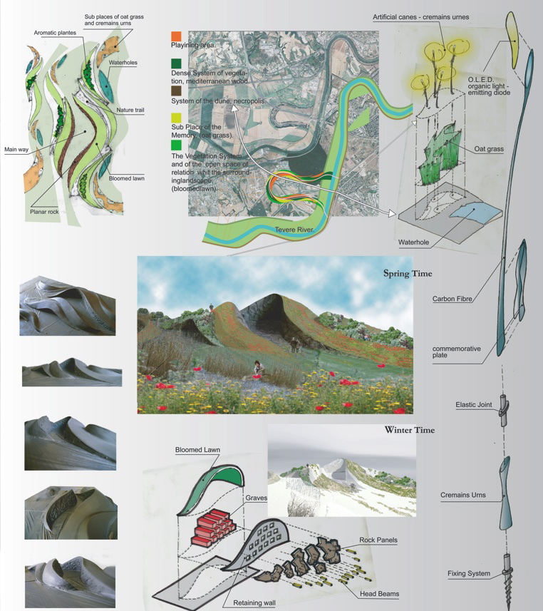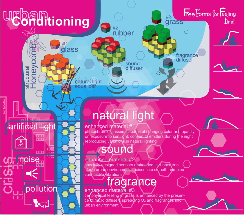 Among the research work of Nitro is the project Memnostyle for new issues of cemetery space that integrates land treatments, architecture and new hybrid design elements, the project “Urban Eirey” that proposes an integrated element for urban situation that integrates leisure sound and air treatment and the built prototype “Electronic Palm” (an hybrid object half natural half highly technological that uses Optical fibers, sound and sensors)