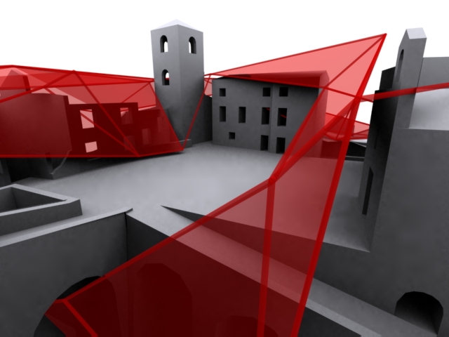 La seconda e definitiva ipotesi invece si basa su un procedimento inverso: abbiamo ricavato le curve di livello su cui il paese è stato costruito e le abbiamo trasformate in un diagramma, costituito interamente da triangolazioni (mesh). La griglia ottenuta segue l'andamento del terreno. Essa è modificabile per essere adattata alle esigenze funzionali (necessità di creare degli spazi coperti, delle strutture di sostegno, ecc...) spostando i punti-vettori sia in altezza che in piano. Tale operazione ha generato in alcuni punti delle superfici, a volte tele per proiezioni, a volte reti per la crescita di rampicanti, a volte coperture, creando una installazione a scala paesistica.