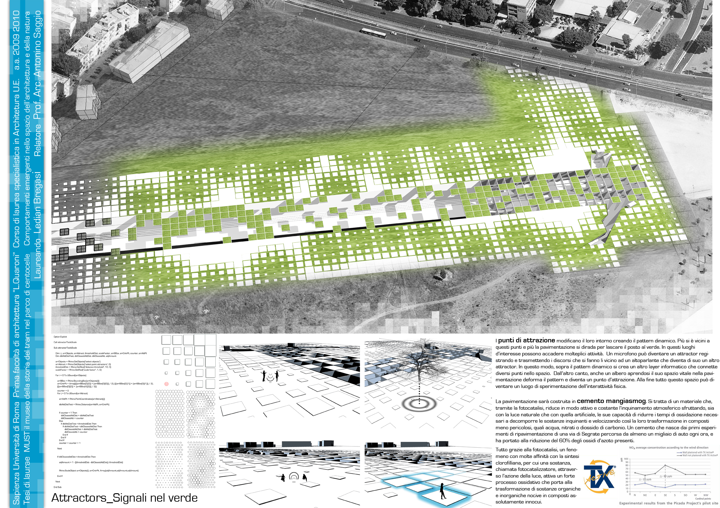 Per ricucire la trincea si usa un pattern che si serve di uno script che utilizza tecniche di flock behavior (stormo) e di automa cellulare. La configurazione finale del pattern è controllata parametricamente da attractor che diventano nel progetto veri e propri punti fisici di organizzazione del parco.