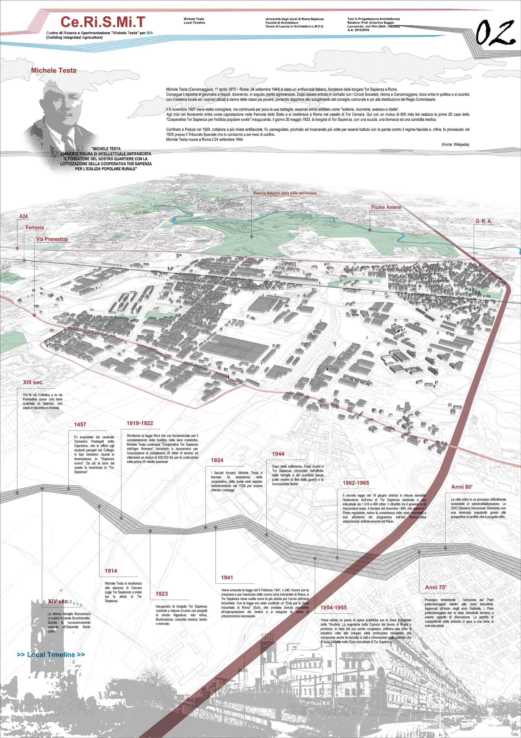 Ma perché il progetto prende il progetto prende il nome di Michele Testa? La vicenda storica legata al personaggio fondatore del quartiere Tor Sapienza ha fatto decidere di progettare un centro di ricerca dell’agricoltura che cerchi di fornire un contributo alla situazione odierna: la crisi nella sostenibilità agricola/ambientale delle città. Contemporaneamente, il progetto si colloca in un’area sotto utilizzata che si trova nella periferia est di Roma vicino a GRA. Dal punto di vista del programma l’idea è di collegare il Centro con il MAAM (Museo dell’Altro e Altrove di Metropoliz) che è il terzo museo dell’arte contemporanea di Roma.