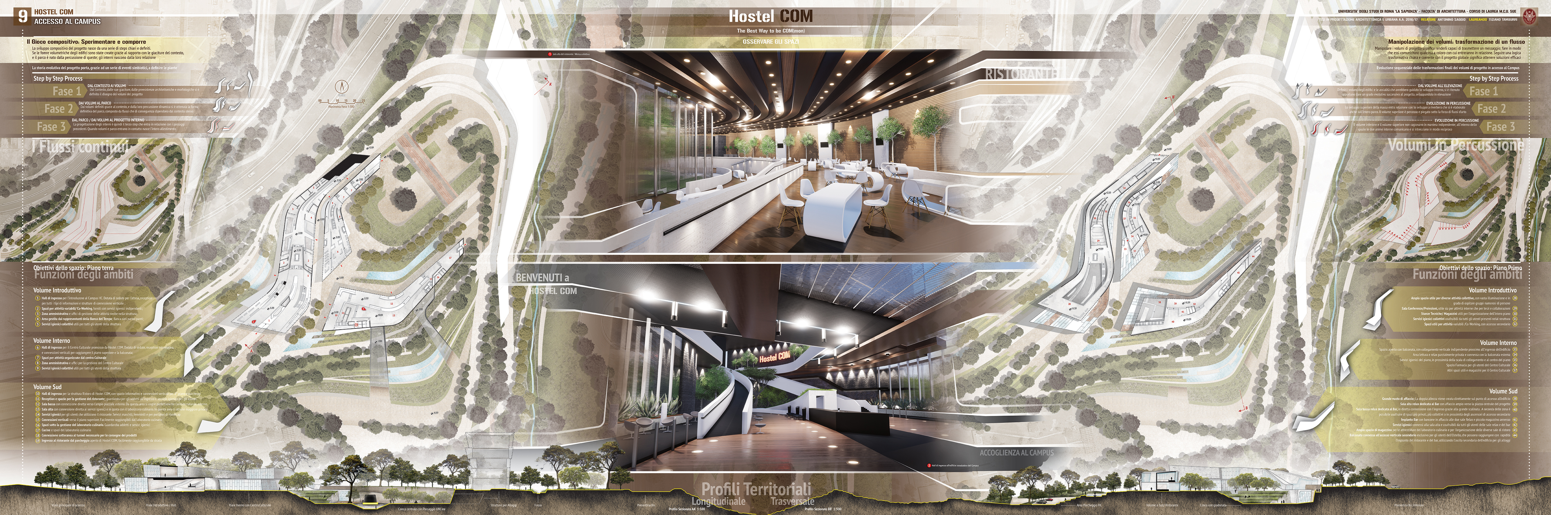 In un territorio complesso come quello della periferia romana in particolare nella zona lungo la via Prenestina Bis all’altezza del parco della Mistica nasce il progetto Hostel COM, Residenze temporanee e permanenti, Banca del tempo, Centro culturale e Co-Working, Accesso al Parco. Si tratta di una realtà innovativa che si pone l’obiettivo di creare valori di socialità troppo spesso perduti nelle nostre città e allo stesso tempo fornire una significativa attrezzatura nella città di Roma. Se analizzino il contesto urbano del Municipio V di Roma emerge la presenza di grandi arterie viarie come la Prenestina, la Tiburtina, via Palmiro Togliatti che si estendono sino al GRA che determinano un tessuto fortemente disconnesso morfologicamente. In particolare il quartiere di Tor Sapienza è legato a eventi socialmente molto gravi. Tra le criticità ben note vi è l’inefficienza dei collegamenti con i mezzi pubblici, la forte presenza di campi abusivi, la diffusa esistenza di edifici abbandonati e pericolanti, l’elevato tasso di criminalità. Tra questi assume primaria rilevanza quella che spesso viene ignorata: una crisi che nasce a partire dalla mancanza di luoghi aggregativi, di aree urbane ad uso collettive e di strutture a servizio dei giovani. A seguito di crisi così evidenti, intensificate dal continuo conflitto tra popolazione locale e comunità immigrate, si afferma uno stato di malessere sociale diffuso che privilegia un agire individualistico, che dimentica il grande valore che hanno invece la collettività e la cooperazione all’interno della città. E’ proprio a partire da tale considerazione che nasce la proposta del progetto Hostel COM che innanzitutto intende innescare enzimi in controtendenza per iniziare a far rinascere meccanismi di condivisione.