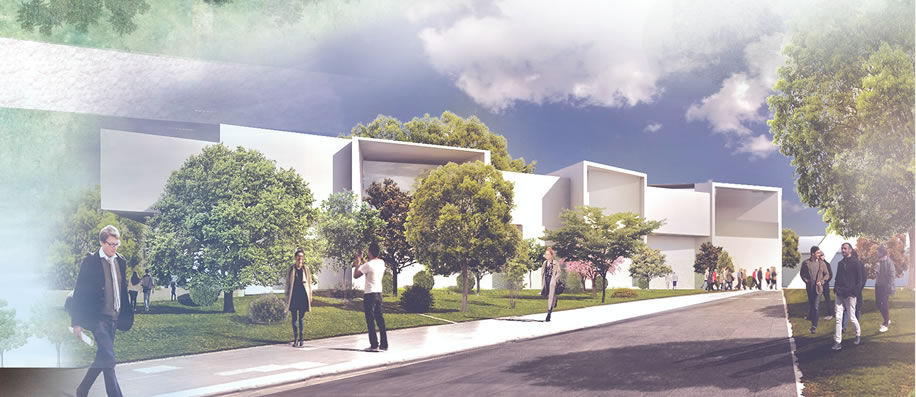 Un programma così complesso rende necessario la progettazione di uno spazio fluido, capace di integrare le diverse utenze, i cui flussi vengono amministrati dalla matrice stessa del parco come se fosse una vera e propria propagazione biologica che garantisce alti livelli di permeabilità di percorrenza. Tema di approfondimento compositivo ed architettonico è il Centro dell’Arte e della Cultura, edificio di nuova costruzione che si colloca vicino alla piazza centrale, cuore pulsante del parco e sede di molteplici attività sociali. Percorrendo il largo viale che dalla fermata della UNLostLine raggiunge l’edificio, ci si trova d’innanzi ad un volume dalla forma allungata, che si staglia come barriera a protezione delle realtà private collocate all’interno dei capannoni, ma allo stesso tempo convoglia al suo interno i principali flussi, divenendo pertanto una percorrenza fondamentale per raggiungere le altre attività del parco. Il tema dell’arte, seguendo l’esempio del Maam, diviene importante per ricucire gli strappi di natura sociale all’interno del territorio, in virtù della capacità intrinseca dell’arte di essere linguaggio universale: in merito a queste considerazioni, il Centro dell’Arte e della Cultura propone al suo interno una serie di attività legate alla musica, all’arte, alla danza e al teatro. Vi trovano spazio anche aule di formazione linguistica, che possano essere di ausilio a stranieri per imparare la lingua italiana, ma anche agli italiani che desiderano apprendere una seconda lingua. La struttura si articola in tre livelli, di cui il piano terra rappresenta lo spazio in cui si concentrano i maggiori flussi ed attività, comprensivo di una grande area espositiva e polivalente, capace di accogliere spazi per il relax, lo studio ed il semplice svago. Il grande patio verde interno permette alla luce di raggiungere le aule poste nel piano interrato e limitrofo alla piazza, e convoglia l’illuminazione prodotta dai lucernai posti sulla copertura, orientati tutti verso sud.