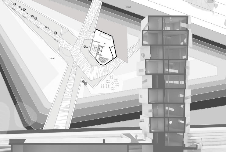 IN_FORMATION Centro per il miglioramente e lo sviluppo del contesto urbano della città di Romadi Ivan De Cataldo viene a costituire una sorta di chiave di volta per ipotizzare concretamente alcuni aspetti della nuova centralità definita dal Piano regolatore per il quartiere di Torre Spaccata. Gli scopi e le articolazioni del progetto sono molteplici. Dal punto di visto della morfologia urbana, l’intervento si caratterizza come un vero e proprio innesto che valorizza l’ambito urbano in cui si colloca (una area semi abbandonata usata come deposito tramviario). Il progetto si articola in tutte le direzioni: dall’asse della Casilina, con l’arrivo dei flussi dei viaggiatori dalla fermata della Linea C, dall’anello dell’Urban green line che qui trova un punto di sosta importante, dalla ferrovia per i colli che corre lungo la consolare. Il progetto da una parte incanala al suo interno questi flussi dall’altra determina con la propria morfologia nuove relazioni. Innanzitutto si connette con la parte interna del quartiere, valorizzandone l’asse di penetrazione, dall’altra sviluppa e amplia il contatto con il parco di Centocelle e infine riconnette l’area ove sorge il Mausoleo di Sant’Elena.
