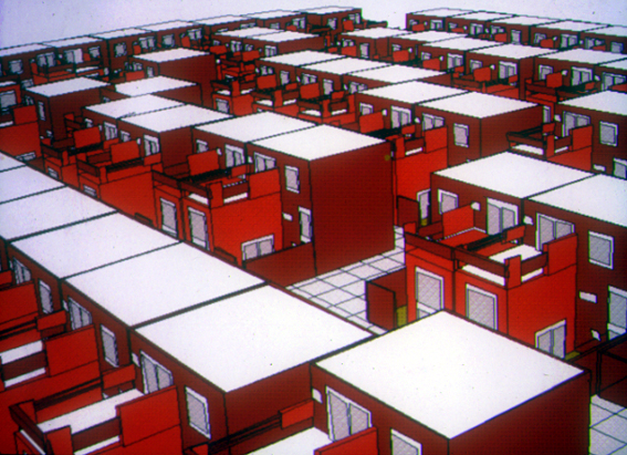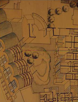 In secondo luogo, i due progetti residenziali che sono stati descritti sono stati impostati a mano libera per quanto riguarda líarticolazione della pianta e la sezione. Successivamente sono stati disegnati in scala e verificati dimensionalmente in un programma per vettori. Mentre nel primo concorso la planimetria è nata direttamente nel modello tridimensionale, nel secondo, data la complessità topografica della situazione esistente, il progetto planimetrico è avvenuto principalmente su carta. La planimetria finale di progetto è stata ottenuta infatti attraverso piccole deformazioni e rotazioni delle case per seguire i confini delle strade adiacenti. Per raggiungere questo risultato progettuale (e forse anche per concepirlo) sia il programma bidimensionale che quello tridimensionale risultarono inadeguati. Ciò nondimeno il modello fu utile per la progettazione delle singole case, per le relazioni spaziali che si avevano in piccole aggregazioni e per la creazione di immagini di dettaglio sia assonometriche che prospettiche da inserire nella presentazione (vedi Figura 14). Direi che i limiti operativi incontrati, che possono turbare chi del Caad fa una religione, non sono stato sentiti come tali allíinterno del gruppo di progettazione che ha saputo prendere da quanto i diversi ambienti ? tradizionali o elettronici ? potevano dare.