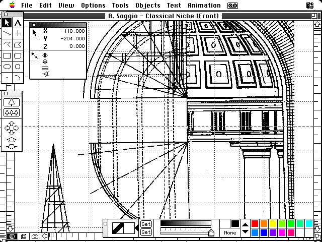 Innanzitutto è possibile al livello di personal computer ottenere un processo interattivo di progettazione che si basa su una struttura gerarchica per oggetti. È importante sottolineare la piccola scala dell'elaboratore (Macintosh II, 5 MB di Ram) perché si è di fronte a un costo relativamente basso e quindi a una possibile diffusione su larga scala di queste modalità operative. Naturalmente siamo anche lontani dalle velocità che permettono le workstation più potenti [4], eppure una costruzione attenta del modello permette la gestione di grandi quantità di informazioni e líutilizzo di questa impostazione in molte occasioni progettuali.