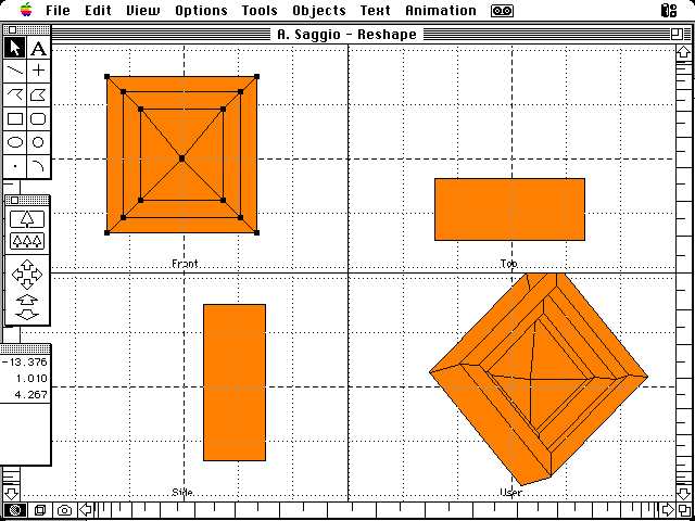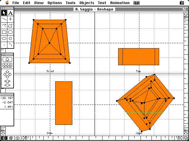 Líambiente di lavoro di cui discuteremo (Aldus Super3D versione 2.00) è frutto di un gruppo con a capo Michael Martin e opera in qualunque elaboratore della famiglia Macintosh prodotti dalla Apple computer. Dal punto di operativo, gli aspetti fondamentali di questo ambiente di modellazione per superfici sono i quattro seguenti: