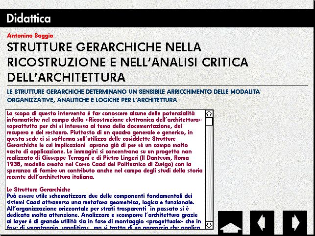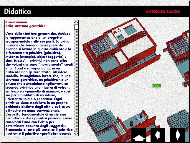Approfondimenti e lettureAntonino Saggio, architetto e urbanista, ha iniziato a lavorare e a insegnare Caad nel 1984 alla Carnegie-Mellon University di Pittsburgh Usa. Dal 1990 al 1993 ha tenuto dei corsi al Politecnico federale Svizzero di Zurigo. Oggi fa parte del corpo docente del Corso di perfezionamento (direttore prof. Sergio Lenci) offerto dalla Facoltà di Architettura di Roma e dal Dipartimento di progettazione architettonica e urbana de "La Sapienza" che si prefigge di usare il Caad a stretto contatto con lo sviluppo del progetto.