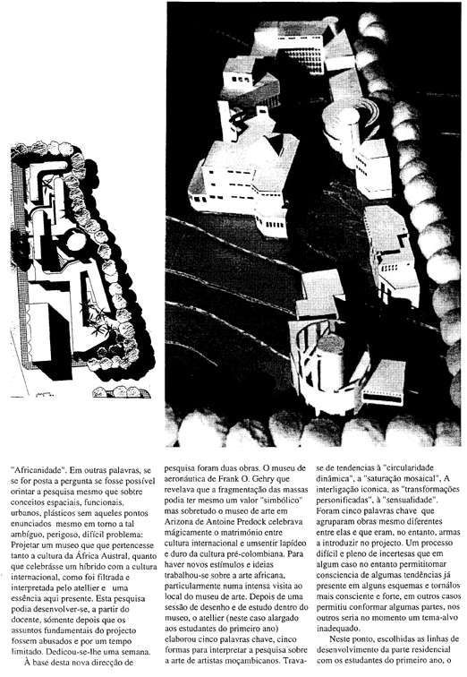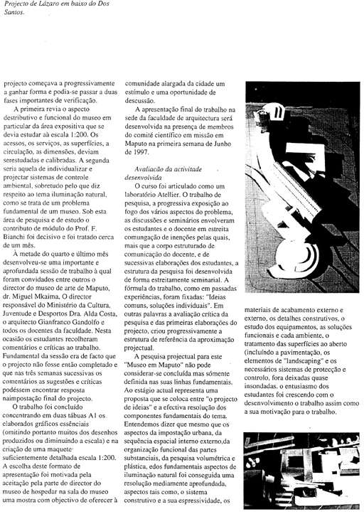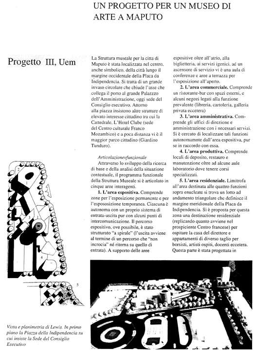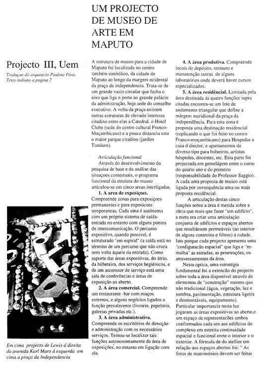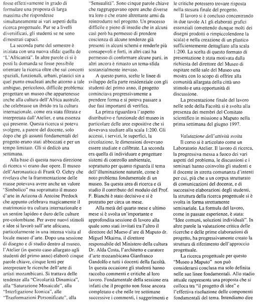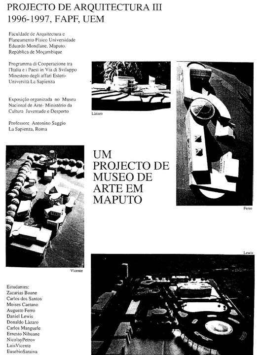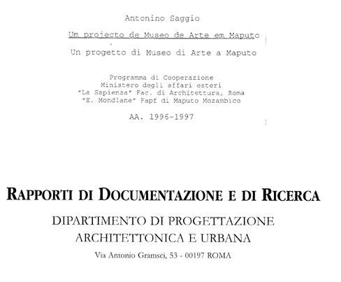 Dispensa in Portoghese e Italiano che racconta i l'esperienza didattica svoltasi nel 1997 a Maputo Mozambico dove il corso di progettazione dell'ultimo anno e quello del primo hanno lavorato insieme per un progetto di un miseo di Arte nella capitale mozambicana. Il progetto è stata l'occasione di una mostra dei progetti nel  Museo di Arte di Maputo nel giugno 1997 e di un seminario a Roma l'autunno successivo.