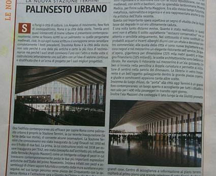 Ora l'edificio contemporaneo più efficace per capire Roma come palinsesto urbano è proprio la Stazione Termini, la cui recente inaugurazione (la terza della sua storia), ci consente alcune osservazioni. La Stazione Termini che conoscevamo era stata inaugurata da Luigi Einaudi nel 1950 ed era il frutto di due fasi. La prima, la cui costruzione iniziò nel 1938 per essere inaugurata per l'E42, era stata concepita dall'architetto più influente delle ferrovie (Angiolo Mazzoni) come un intrigante collage di pezzi in cui trovavano contemporaneamente posto le due più importanti espressioni artistiche dell'Italia del primo Novecento. Iniziava infatti con pezzi e assemblaggi di chiaro sapore Futurista a contatto delle mura aureliane e proseguiva nel suo lungo percorso verso piazza dei Cinquecento con la cadenza ritmica e l'astrazione cara a Giorgio de Chirico e alla Metafisica. La progressione sarebbe dovuta terminare con una tronfia facciata che non fu realizzata per l'arrivo della guerra. Il concorso del 1947 permise di completare l'opera con una nuova e splendida soluzione per la testata rimasta incompleta. Si trattava di una scatola pura, la "galleria di testa", che apriva lateralmente la stazione alla città, di un prisma astratto che si impennava verso l'alto solcato da secche asole, e soprattutto di una dinamica pensilina a doppia curvatura che indirizzava il visitatore verso le terme di Diocleziano e il centro città.