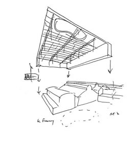 두개의 작품이 그 열쇠이다: 첫째는 빌바오 구겐하임박물관이다. 얼핏보기에 이 작품은 미래주의적 성향을 띤 습작이라고 할수 있지만 사실에 있어서 새로운 문명공간을 창조하는 교착점이다. 둘째는 뚜르꾸앙미술쎈터이다. 겉보기에는 현존건물들을 보존하는것에 불과하지만 실은 낡은건물들의 지붕과 새 지붕사이에 공간을 창조하여 삐라네시가 그려보았던 계곡들을 련상시키게 되는것이다.