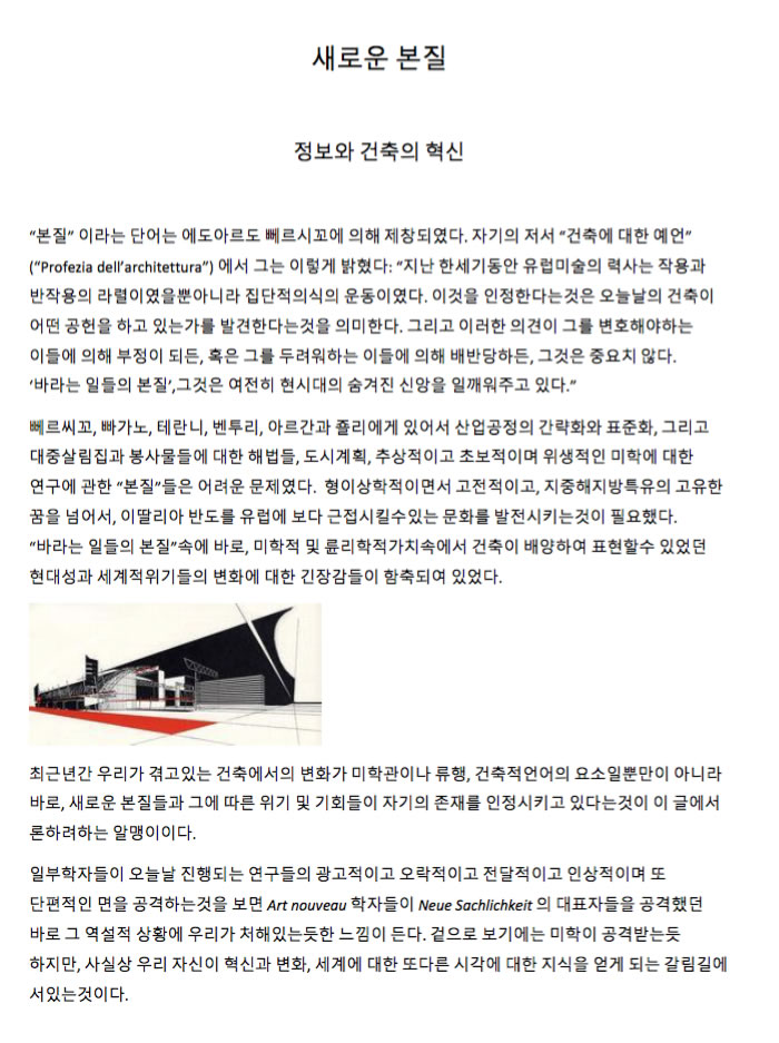 새로운 건축을 연구하는데 관하여 자주 제기되군하는 비판들중의 하나는 바로 건설물 혹은 건설 그 자체로부터 암묵적으로 “진실”을 없애버리게 되는 “광고 혹은 소통”형태들에 다가간다는것이다. 이러한 고찰은 의심의 여지가 없이 일리가 있는 말이다. 이에 대답을 주기 위해서는 지난 30년간 소통분야에서 어떤 일이 일어났는가를 먼저 물어야 할것이다.