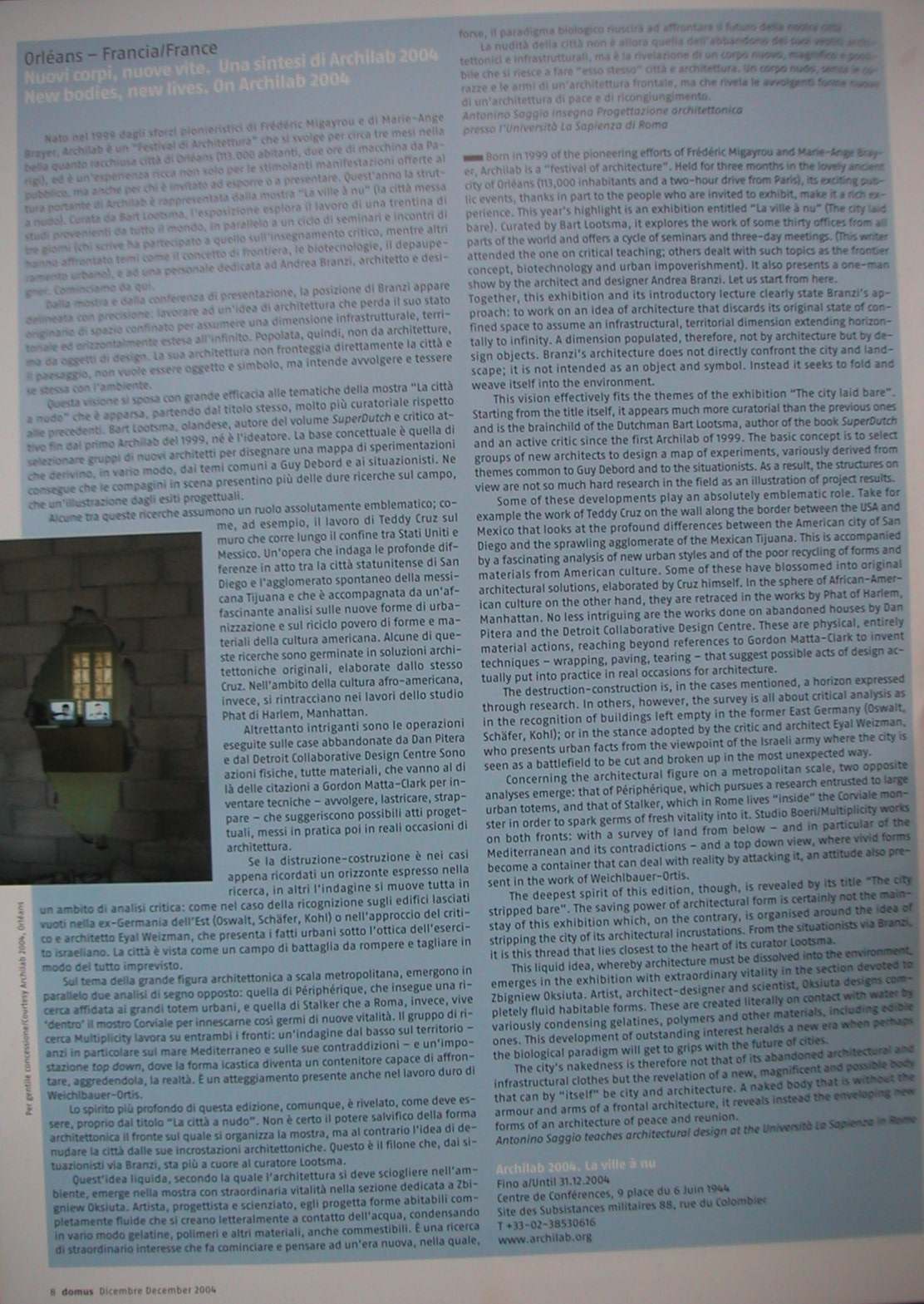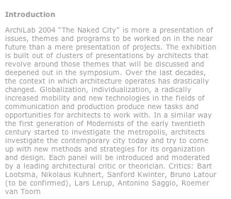 In questo quadro nasce la manifestazione di quest'anno con la mostra principale del lavoro di trenta studi invitati da tutto il mondo sotto il titolo "La città a nudo /La ville à nu", curata da Bart Lootsma con un ciclo di seminari e incontri di tre giorni (chi scrive ha parlato a quello sull'insegnamento critico mentre altri sono stati sul tema della Deriva, delle Frontiere, delle Biotecnologie, del Depauperamento urbano) e con la personale dell'architetto e designer Andrea Branzi. [segue nell'articolo di As IN PUBBLICAZIO NEL DiCEMBRE 04 )NUOVI CORPI NUOVE VITE UNA SINTESI DI ARCHILAB 2004