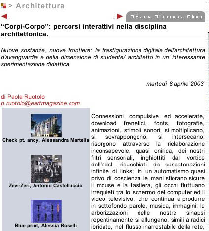 È redatto dopo un primo ciclo di incontri che verte sul rapporto tra informatica e dibattito architettonico contemporaneo e implica l'uso di software raster per la manipolazione dell'immagine.Il corpo, cui si fa riferimento nel titolo, rimanda sia a quello fisico naturale biologico che a quello metaforico-emozionale del proprio immaginario, così come a quello del mondo dell'architettura oggi, come campo da esporre esplorare sintetizzare estendere deformare contaminare con altri saperi/corpi linguaggi codici significati.