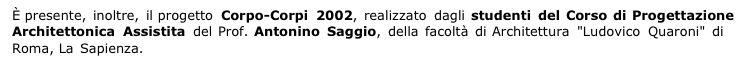 Corpo_Corpi 01/02/03 raccoglie parte del lavoro svolto dagli studenti del Corso di Progettazione Architettonica Assistita, tenuto dal Prof. A. Saggio presso la Facoltà di Architettura "L.Quaroni" di Roma La Sapienza, negli anni 2001/02/03.