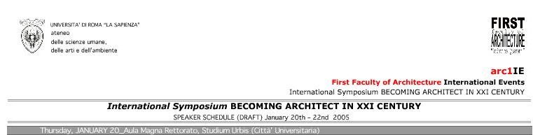 Si è svolto un convegno internazionale a La Sapienza con lo scopo di mettere a confronto esperienze sul grande tema della formazione dell'architetto. La prima sessione (chair L. Barbera) è stata "Italian European and Mediterranean school sof architecture, il pomeriggio la seconda sessione (chairn L. Gazzola) è stata dedicata a"Far asian schools of architecture". Il 21 la terza sessione è stata "North American Schools of Architecture" (Chair D. Ghirardo) la quarta sessione è "Education and professional practise" (Chair A. Schiattarella). Nella sessione"Digital Innovation in architecture" (chair A. Saggio) oltre ad un intervento sull'ultimo corso a La Sapienza As ha tratteggiato il quadro del rapporto tra informatica e architettura in questi anni. Tra le relazioni estere vi sono state quelle di Patrik Schumacher (St. Hadid), Ed Keller Karl Chu, (Columbia), Mark Goulthorpe (Decoi, Mit).