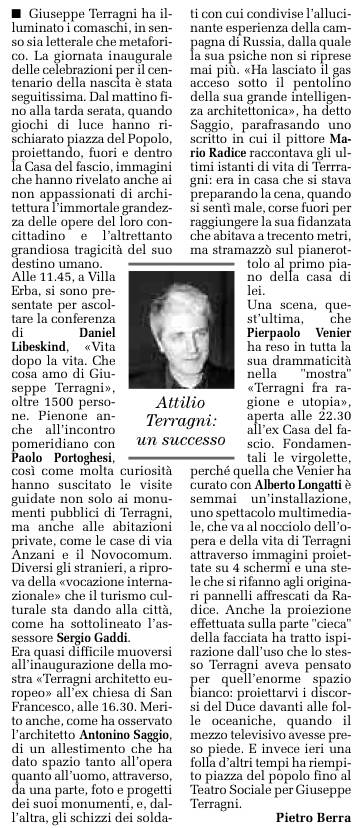 ... Terragni lascia veramente il suo lavoro per noi come le porte spalancate di cui parla Radice, Terragni davvero ha lasciato per noi, se vogliamo leggere, tutte le luci accese, Terragni davvero ha bruciato la sua esistenza, ma ha lasciato il gas acceso sotto il pentolino della sua grande intelligenza architettonica.