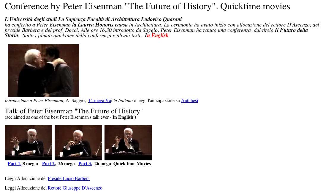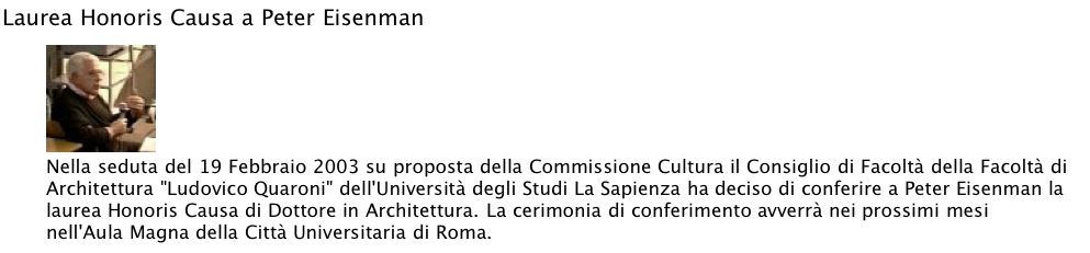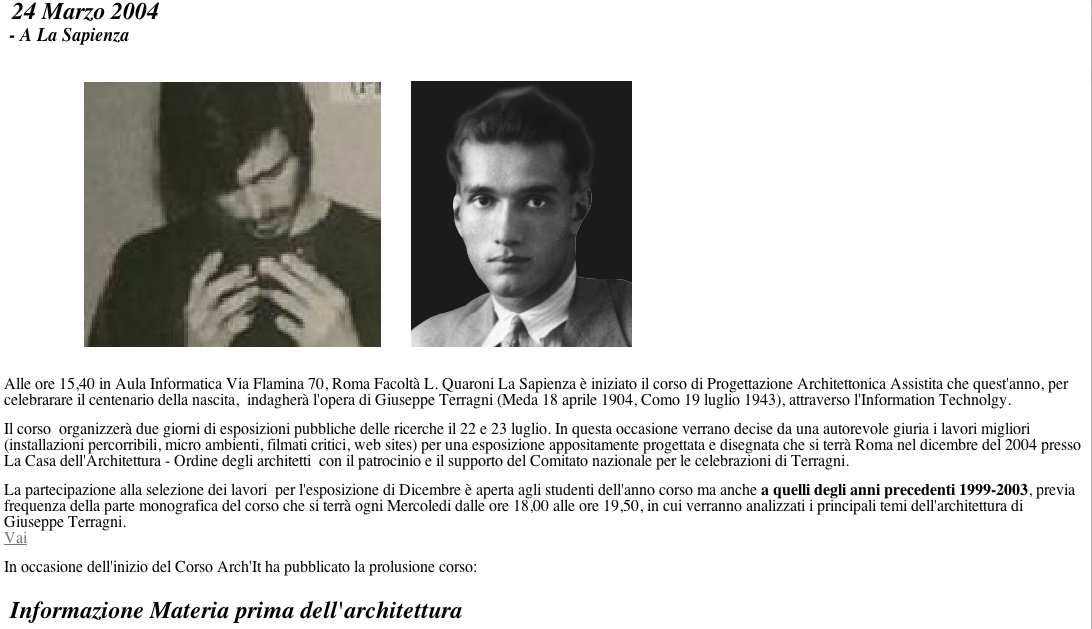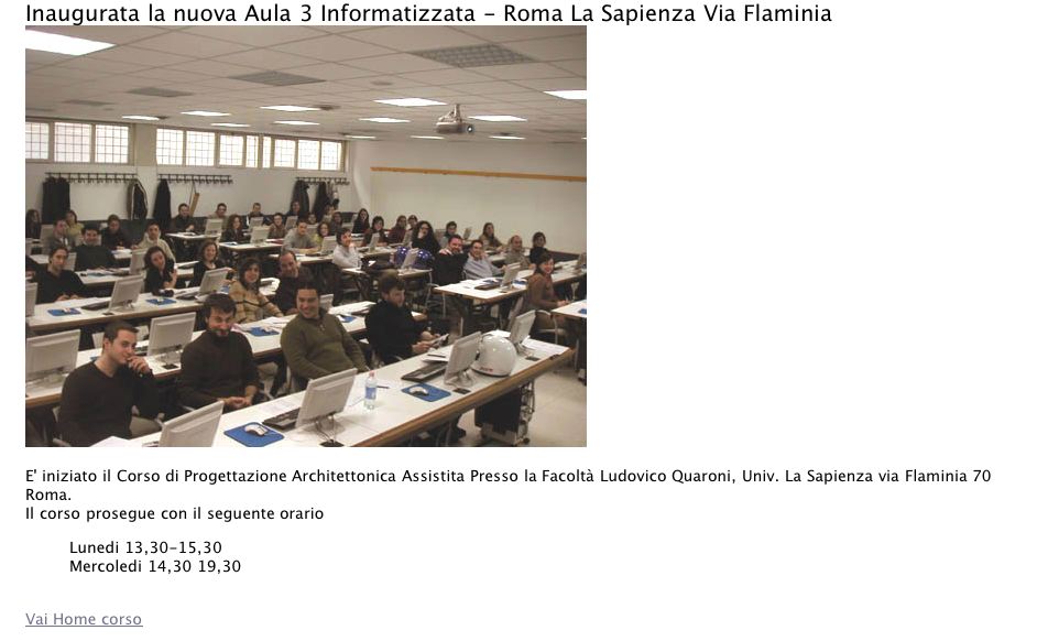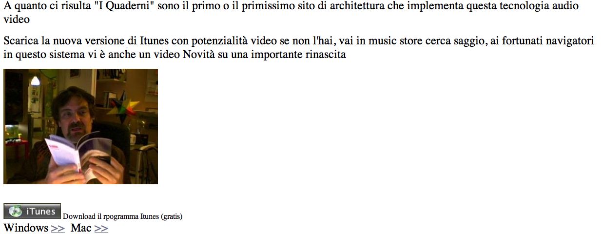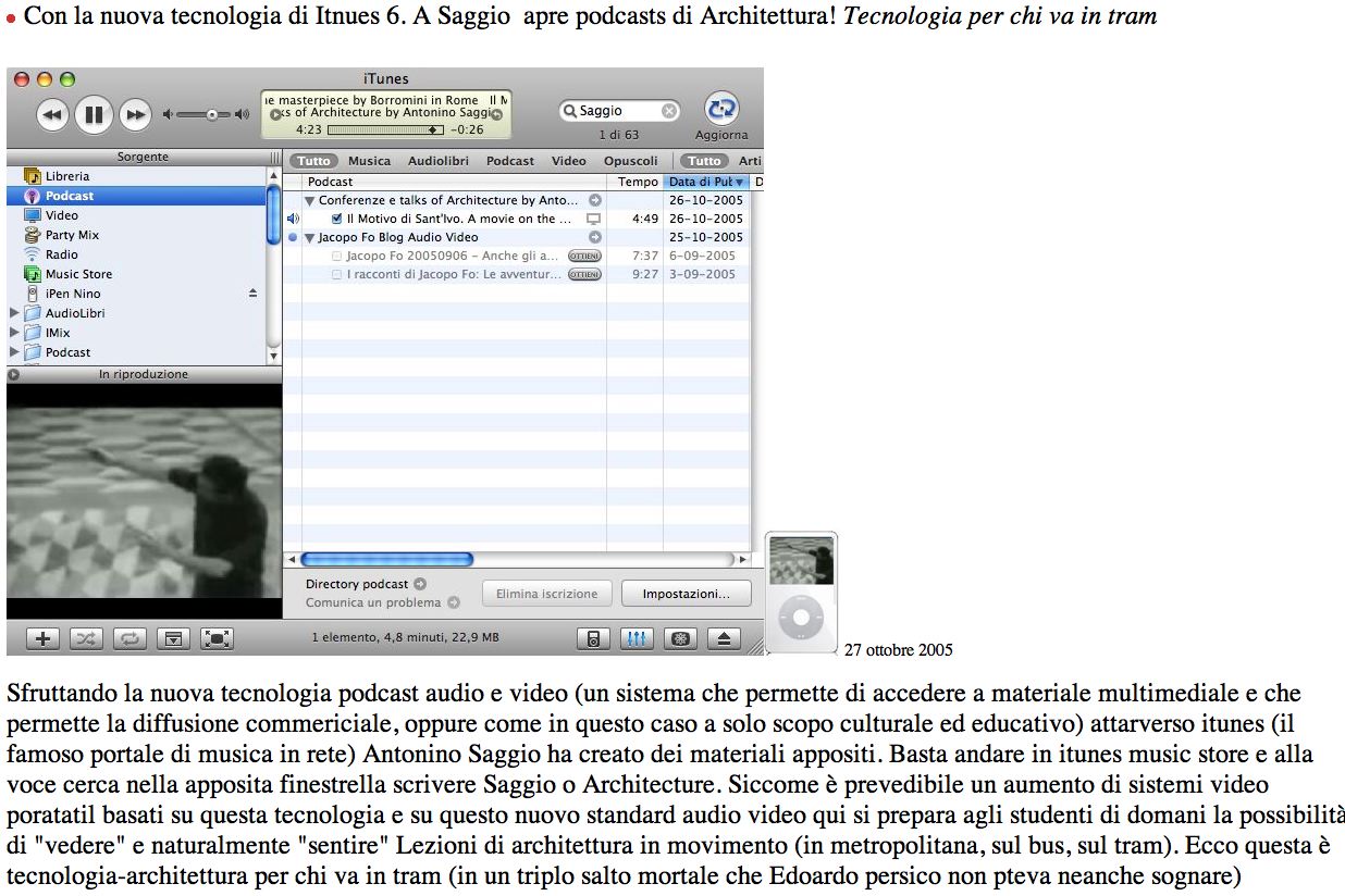 Il 26 ottobre 2006 è passato un anno dall pubblicazione del primo podcast (qualcuno ricorda?, il film il Motivo di Sant'ivo >). Alla prima sono sono succedute 79 altre trasmissioni. Innanzitutto l'intero corso del 2006 alla Sapienza su "Crisi Modernità e Information Technoly" che oltre agli studenti è stato seguito anche da altri appassionati, poi molte conferenze, alcune interviste e qualche importante progetto. Questa attività non è passata, fortunatamente, del tutto inosservata. La Apple l'ha inserita tra i suoi pochissimi link esemplificativi, ma soprattutto grazie a Maria Teresa Paternoster l'Università La Sapienza l'ha recensita sulla stampa quotidiana. Per autofesteggiare la minuscola ricorrenza è pubblicato un podcast su un tema che appassiona molti. Come possiamo definire il paesaggio?. E' un intervento orale in cui anticipo un mio scritto che apparirà in una pubblicazione sul tema di Franco Zagari. Buon ascolto! >