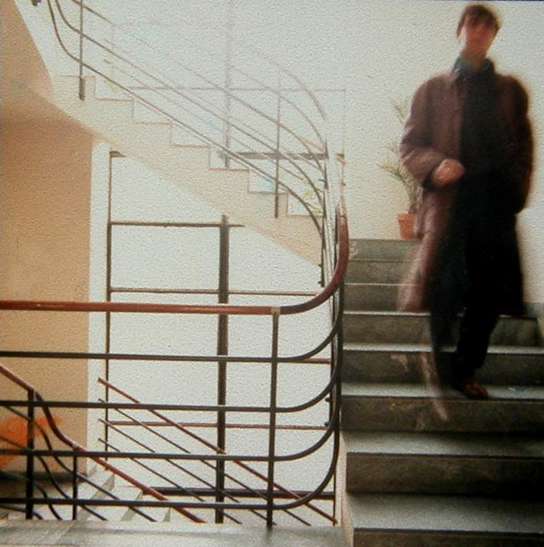 Foto di Dennis Marsico, Antonino Saggio sulle scale del Novocomum, Como Novembre 1987