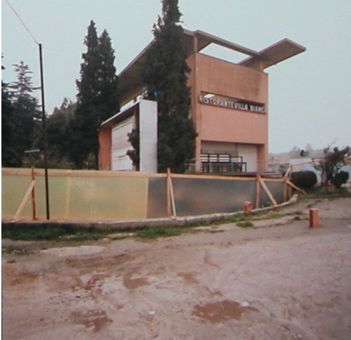 L’inizio è segnato dalla presenza, sulla strada, dello stesso telaio adoperato nella villa Bianca: un elemento antagonista al volume pieno, un