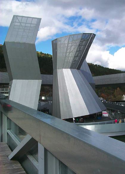 Towers of power: Bienne's arteplage is the largest of the four and is based around a trio of monumental towers clad in a shimmering lightweight metal mesh skin - Critical Essay