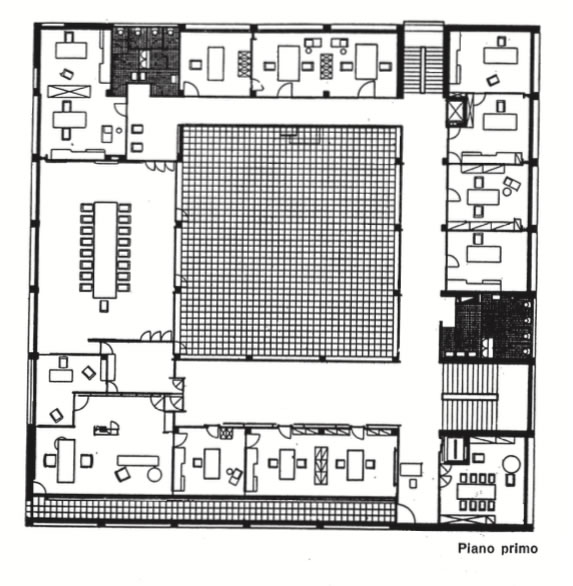 ...Il vuoto centrale si rivela come il negativo del solido entro cui è ricavato, come se volume pieno e vuoto interno facessero parte di uno stesso mondo e si richiedessero anche nell'uso del telaio strutturale a vista l'uno con l'altro .p. 44 , e con la riucitura del telaio nell'ultima campata). p.45