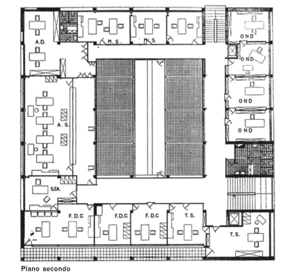 ....Il prospetto a nord è una delle composizioni più belle di Terragni. Un blocco solcato da tre lunghe asole si distacca dalla parete retrostante