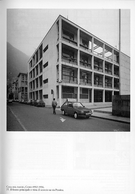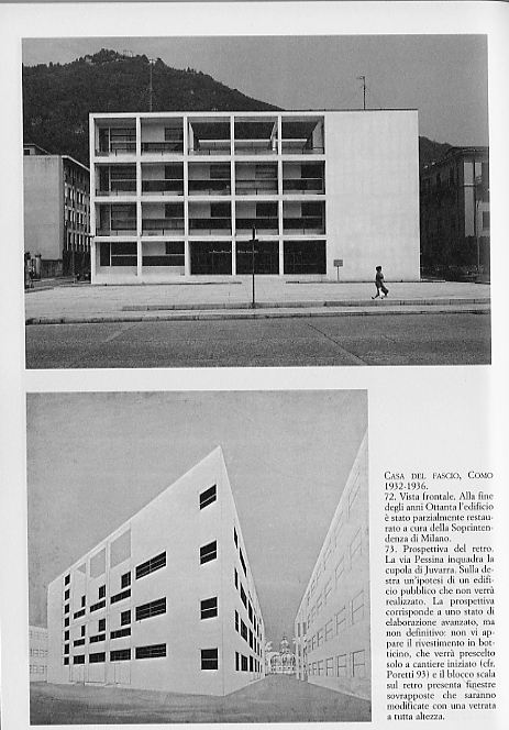 ...il terzo, ideato a ridosso del conflitto, non fu mai realizzato. Ricostruito ed esposto in modello alla Biennale veneziana del 1976, il primo progetto rimane una delle opere più pure del Razionalismo: in una costruzione di acciaio e vetro si incrociano felicemente alcuni motivi tipici di Terragni: nella Rustici il telaio diventa un grande bowwindow che si appende al di sopra del seminterrato p. 59
