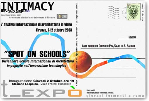 L'edizione 2003 di Beyond Media curata da Marco Brizzi e dall'Università di Firenze ospita  "per la prima volta una significativa esposizione dedicata ad alcune tra le più prestigiose scuole di architettura al mondo": Spot on Schools sostiene la curatrice Paola Giaconia: " presenta una ricognizione di quegli insegnamenti che hanno indagato il tema della comunicazione nel progetto di architettura e l'influenza che in tale campo hanno avuto e hanno i nuovi media."