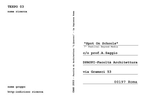 L'edizione 2003 di BEYOND MEDIA/OLTRE I MEDIA ospita per la prima volta una significativa esposizione dedicata ad alcune tra le più prestigiose scuole di architettura al mondo. La mostra Spot on Schools offre una ricognizione di quegli insegnamenti che hanno indagato il tema della comunicazione nel progetto di architettura e l'influenza che in tale campo hanno avuto e hanno i nuovi media.