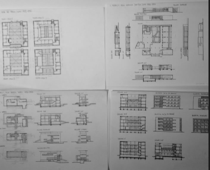 ...Il vuoto centrale si rivela come il negativo del solido entro cui è ricavato, come se volume pieno e vuoto interno facessero parte di uno stesso mondo e si richiedessero anche nell'uso del telaio strutturale a vista l'uno con l'altro .p. 44 , e con la riucitura del telaio nell'ultima campata). p.45