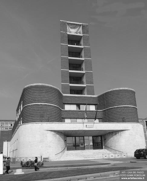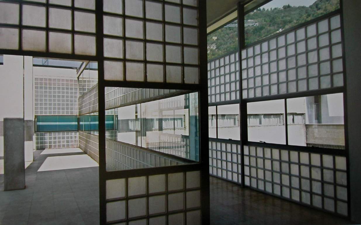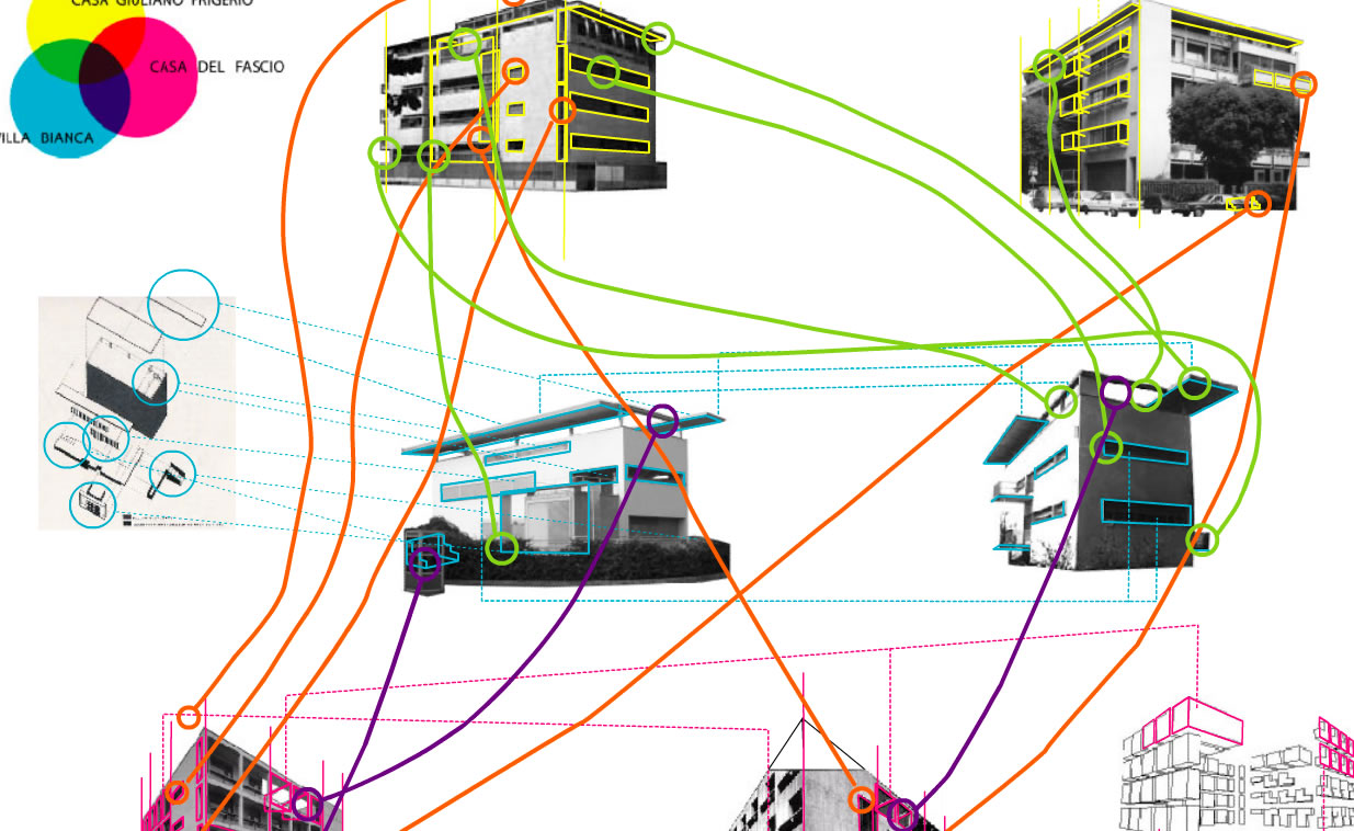 ...the third, conceived close to the conflict, was never built. Reconstructed and exhibited as a model at the Venice Biennale in 1976, the first project remains one of the purest works of Rationalism: in a steel and glass construction some typical Terragni motifs happily intersect: in the Rustici the frame becomes a large bow window that hangs above the basement p. 59 ... The system of composing the facade of Toninello based on the frame (even if the forward/reverse relationship is reversed) seems to identify a syntax p. 60 ...Villa Bianca is preceded by a series of single-family house projects: an ideal theme p. 66 . It is the frame framing on the facade, henceforth "the frame" which had made its first appearance in the back of the Gas Workshop, but which is the salient motif of the Casa del Fascio designed in the same months. The frame allows for a double wall: one on the external front (protecting from the light and delimiting loggias or porticoes) and the other, further back, which collects the fixtures. the wall itself to enclose the volume, here Terragni elaborates the theme of the double wall and the frame. Instead of the loggia motif, the architect invents a giant frame that encompasses the entire building. 67
