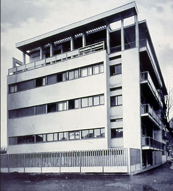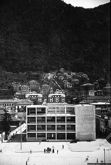 ..two parallelepiped bodies for the actual ovens). Here a theme that will be typical of the mature Terragni makes its first appearance: the characterization of the facade through the frame structure. There is no separation between frame and building, which will be typical of the Milanese works and developed in the last consequences in the Villa Bianca, but there is the same asymmetry between the articulation of the plot structural compared to the actual volumetric mass that occurs in the main front of the Casa del Fascio p.22 ...The central void reveals itself as the negative of the solid within which it is housed, as if full volume and internal void were part of the same world and required each other even in the use of the structural frame in sight .p. 44, and with the re-sewing of the frame in the last span). p.45