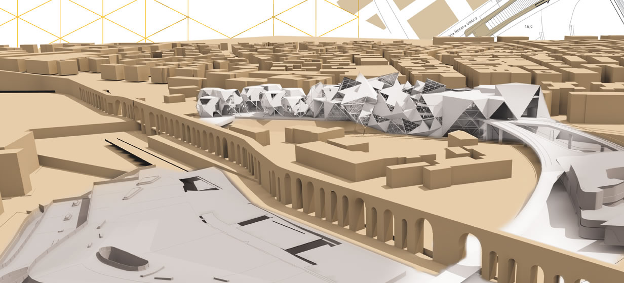 IIN_FORMATION Centro per il miglioramente e lo sviluppo del contesto urbano della città di Roma di Ivan De Cataldo viene a costituire una sorta di chiave di volta per ipotizzare concretamente alcuni aspetti della nuova centralità definita dal Piano regolatore per il quartiere di Torre Spaccata. Gli scopi e le articolazioni del progetto sono molteplici. Dal punto di visto della morfologia urbana, l’intervento si caratterizza come un vero e proprio innesto che valorizza l’ambito urbano in cui si colloca (una area semi abbandonata usata come deposito tramviario). Il progetto si articola in tutte le direzioni: dall’asse della Casilina, con l’arrivo dei flussi dei viaggiatori dalla fermata della Linea C, dall’anello dell’Urban green line che qui trova un punto di sosta importante, dalla ferrovia per i colli che corre lungo la consolare. Il progetto da una parte incanala al suo interno questi flussi dall’altra determina con la propria morfologia nuove relazioni. Innanzitutto si connette con la parte interna del quartiere, valorizzandone l’asse di penetrazione, dall’altra sviluppa e amplia il contatto con il parco di Centocelle e infine riconnette l’area ove sorge il Mausoleo di Sant’Elena.