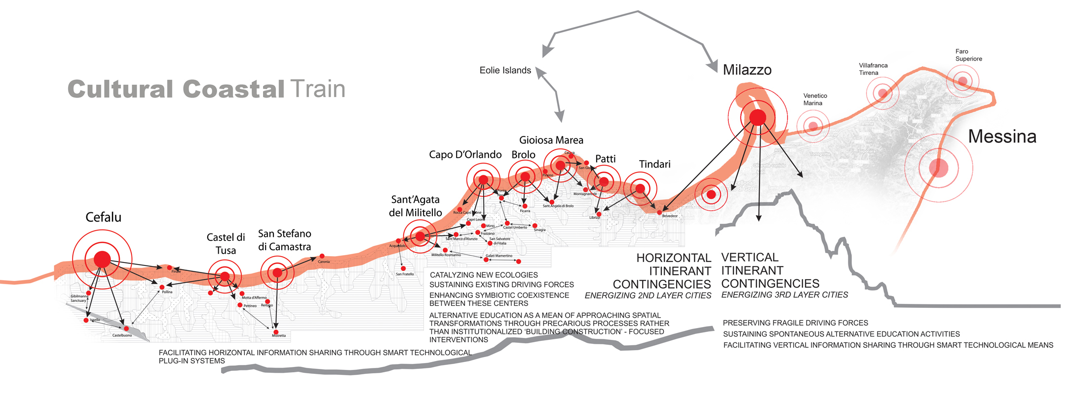 In analogia con le esperienze sistemiche proposte per Roma con La Urban Green Line e con il progetto tuttora in corso di Tevere Cavo si propone la creazione di una Infrastruttura Multitasking e Sistemica per la costa settentrionale tirrenica dellla Sicilia a cominciare col collegamento tra le città di Milazzo e Cefalù, Il Cultural Coastal Train CCT aderisce alle Cinque categorie delineate in queste esperienze e cioè