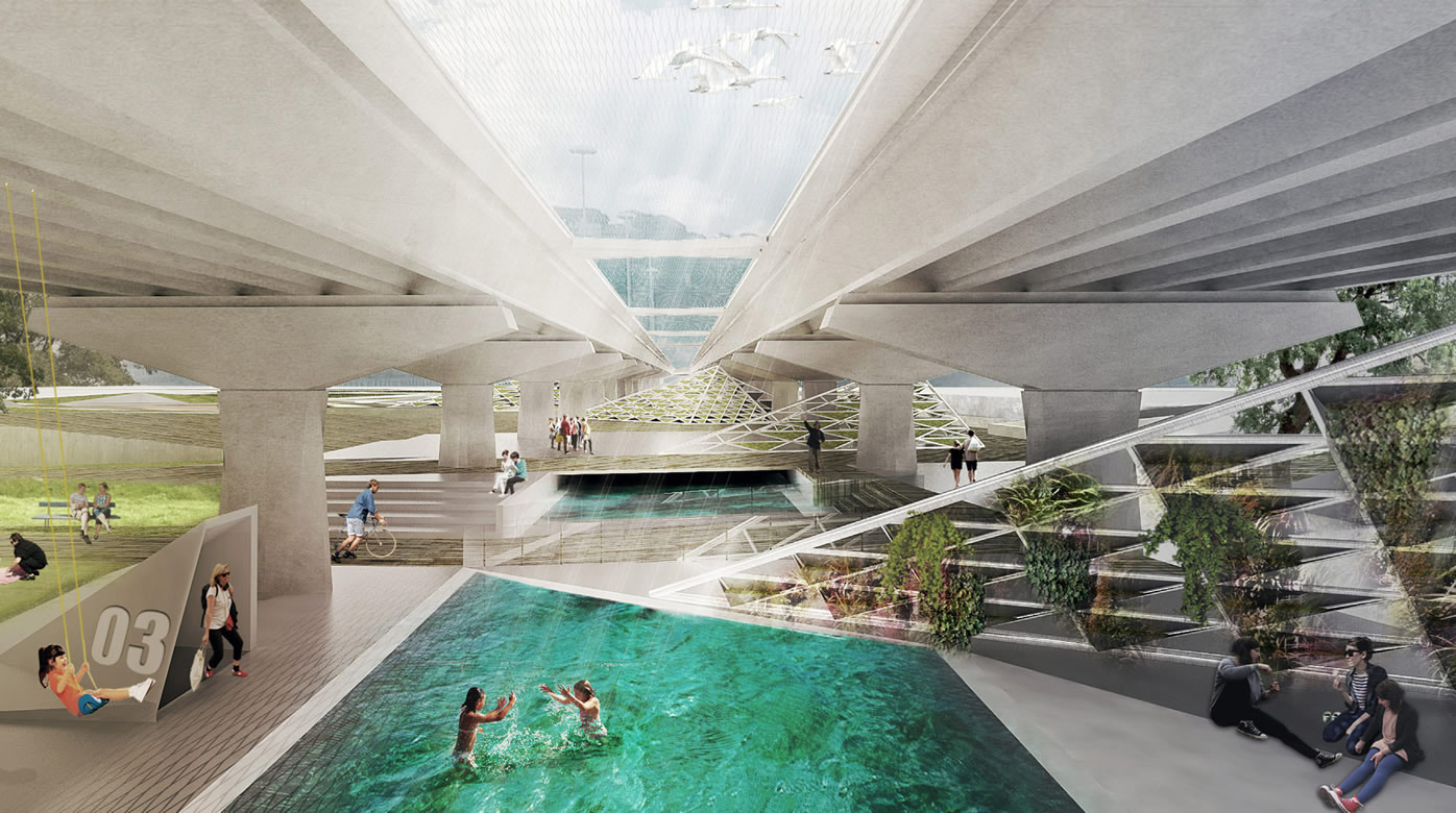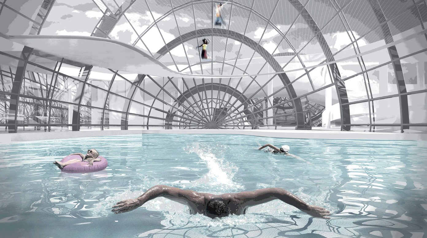 Perspective Michela Falcone, “Water Playground: Urban happiness system for the phytoremediation and the reconquering of the Tiber” Tevere cavo Antonino Saggio Chair project for Rome 2013-2018