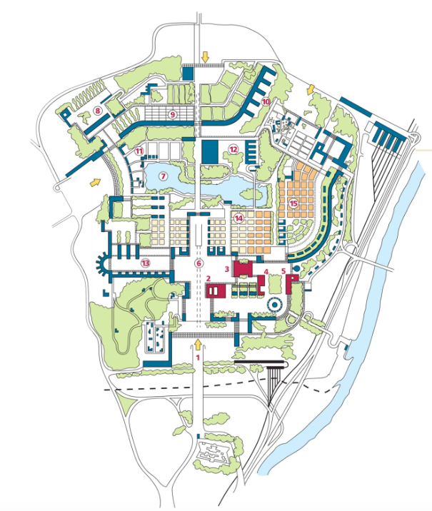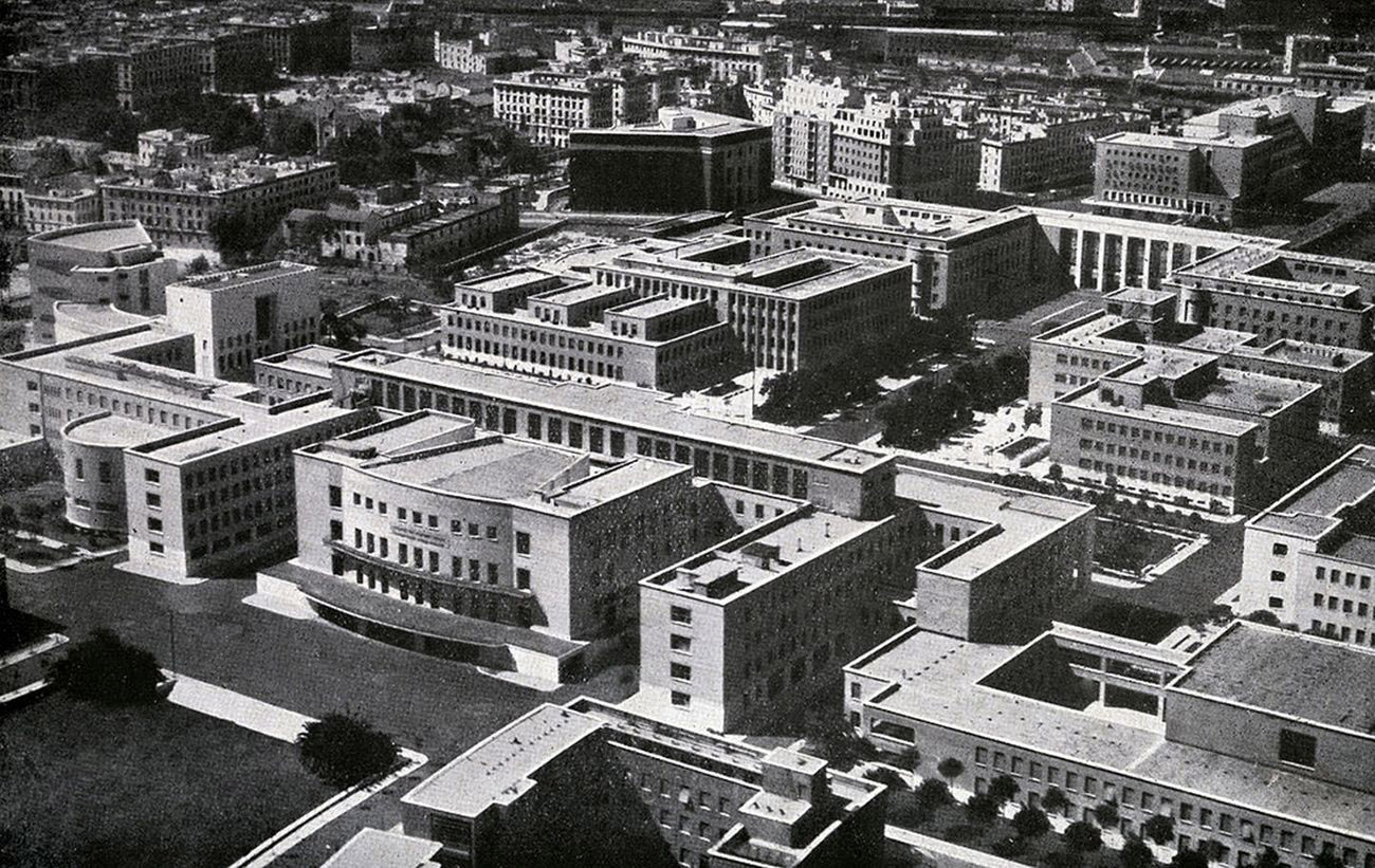 E42 prima Ipotesi planimetrica.Marcello Piacentini e Giuseppe Pagano affiancati da tre giovani emergenti Luigi Piccinato, Ettore Rossi e Luigi Vietti.