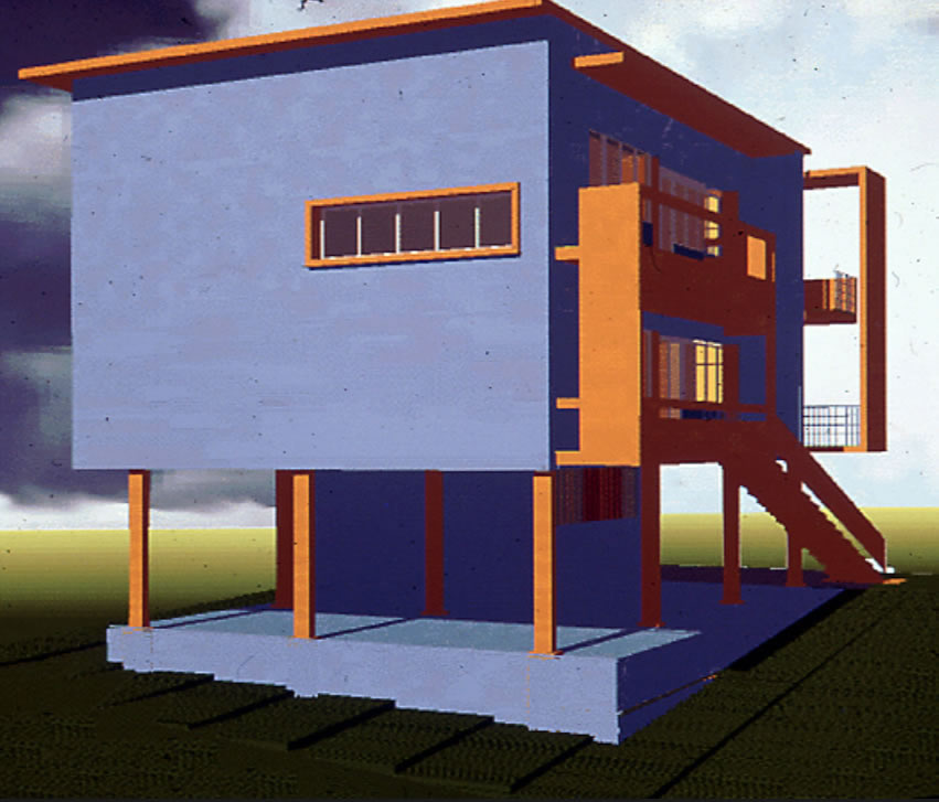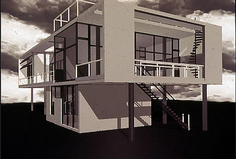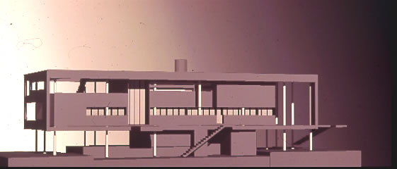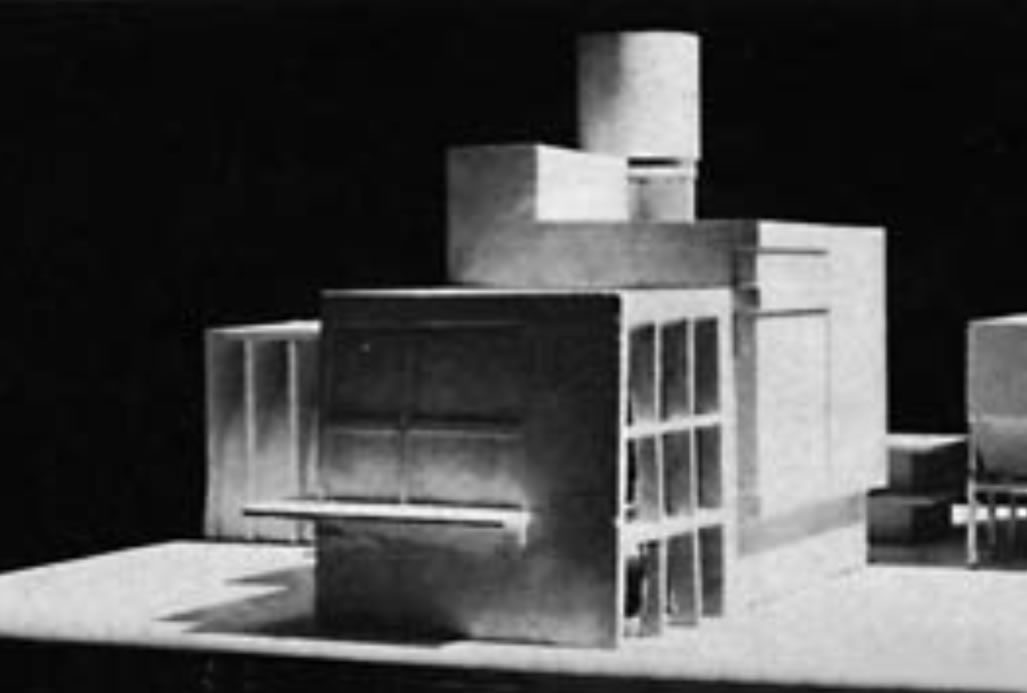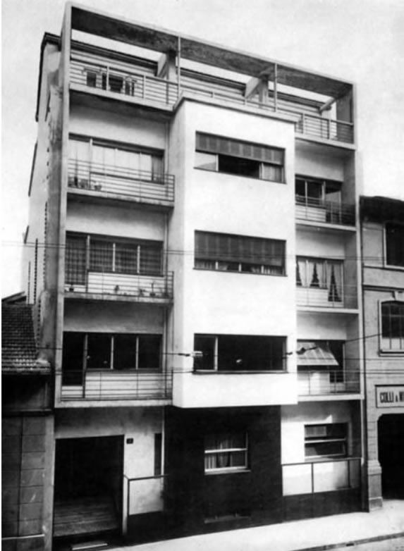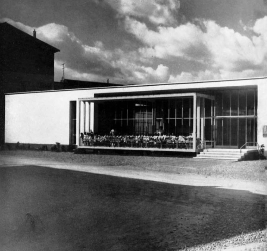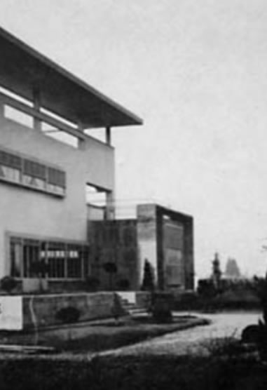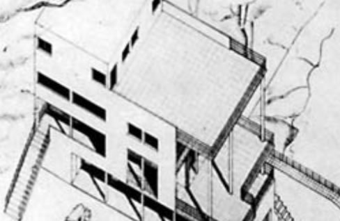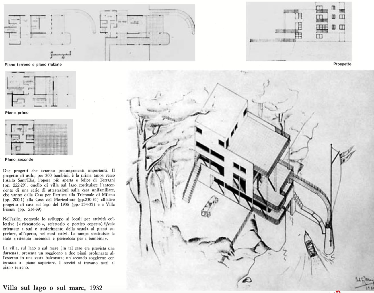 ...il terzo, ideato a ridosso del conflitto, non fu mai realizzato. Ricostruito ed esposto in modello alla Biennale veneziana del 1976, il primo progetto rimane una delle opere più pure del Razionalismo: in una costruzione di acciaio e vetro si incrociano felicemente alcuni motivi tipici di Terragni: nella Rustici il telaio diventa un grande bowwindow che si appende al di sopra del seminterrato p. 59