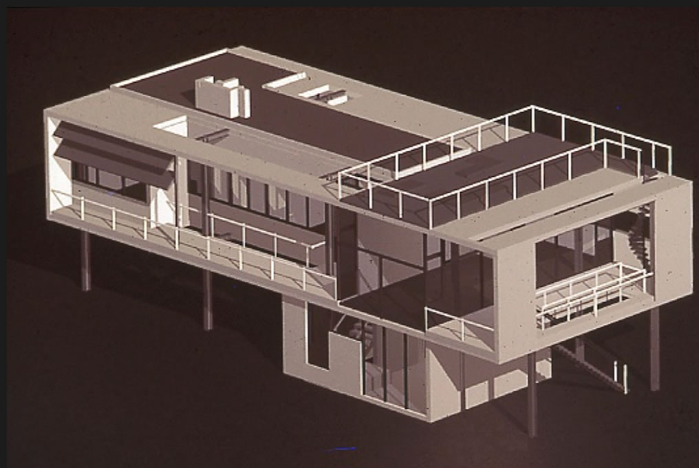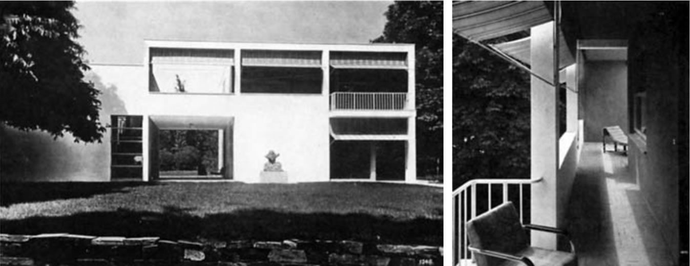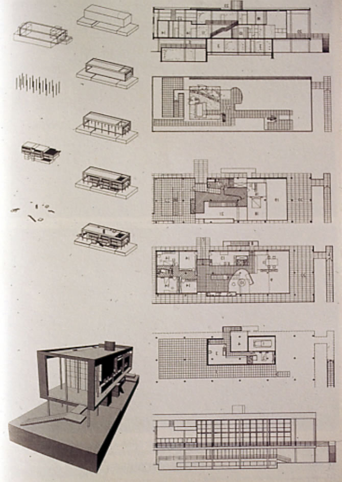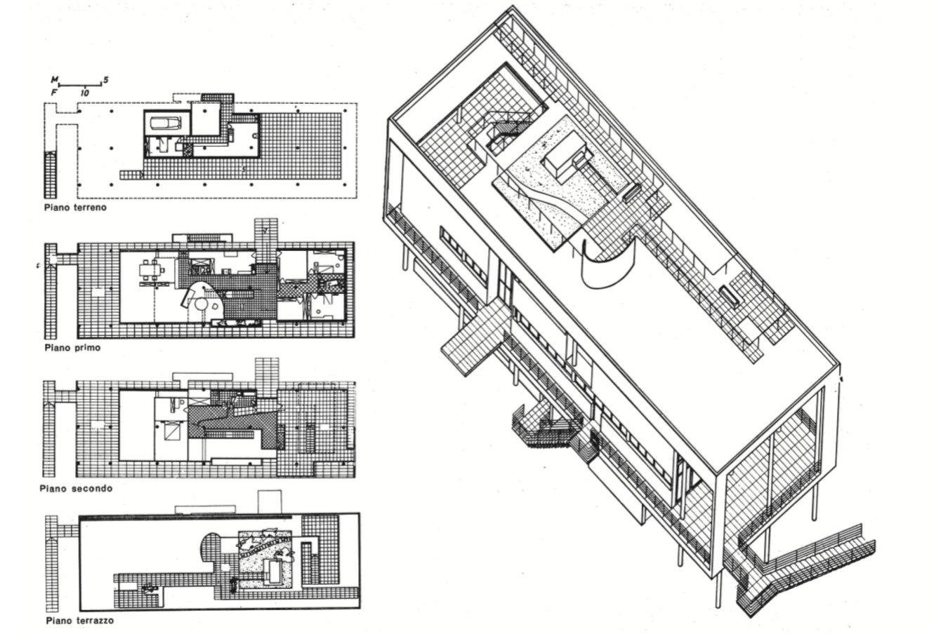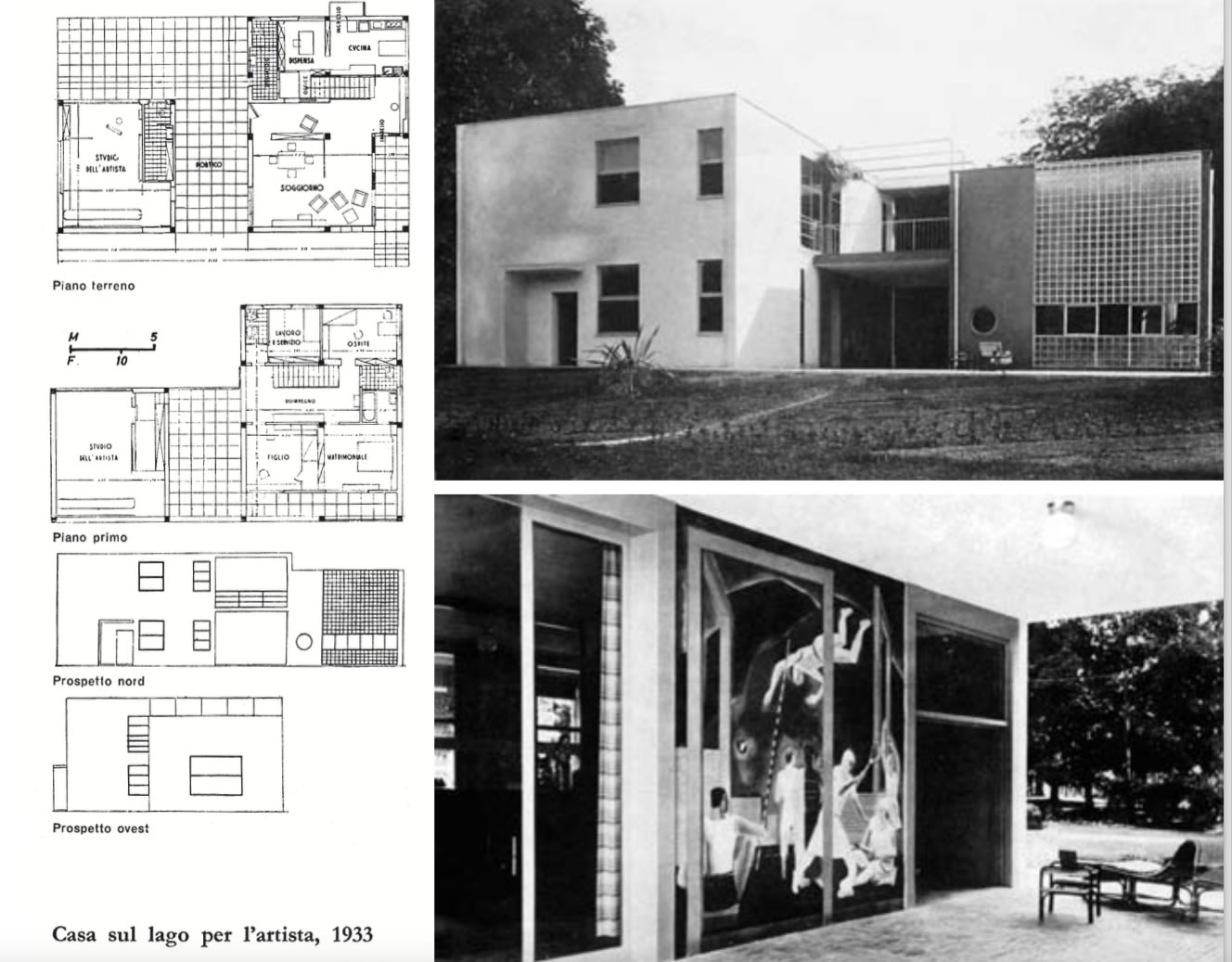 ...Il telaio usato per ritmare, uniformare e dare chiaroscuro nella Casa alla V Triennale e trasformato in un macro contenitore nella Villa sul lago del '36 - compie un altro passo della sua evoluzione. Diviene un elemento antagonista al volume, si svincola così dagli usi precedenti per afiancarsi agli altri elementi «liberi» della casa. La rampa, le scale, la pensiline, il balcone insieme al telaio cospirano la messa in crisidel volume: lo scontro volumetelaio del fronte su strada, la rampa di accesso sul retro, le pensiline del tetto che si proiettano fuori dalla linea della casa, l'aggetto del balcone sull'ingresso attaccano, sbilanciano, spingono in tutte le direzioni degli assi cartesiani il blocco steeometrico. Perché, naturalmente, in questa nuova interpretazione, il volume non è più sospeso ma appoggiato, ancorato direttamente al suolo, p. 69 «coricato» come diceva Pagano.