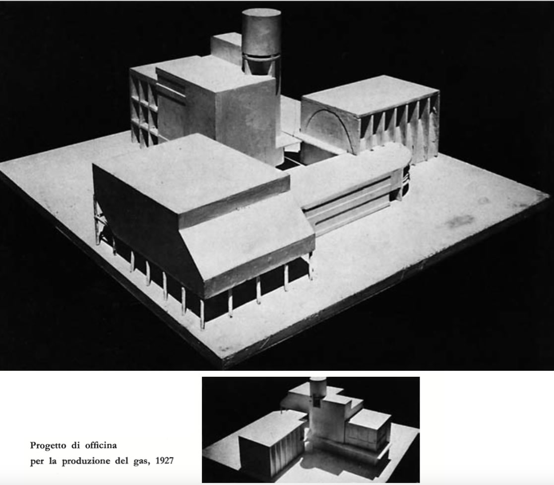 ...due corpi parallelepipedi per i forni veri e propri). Qui fa la prima comparsa un tema che sarà tipico del Terragni maturo: la caratterizzazione della facciata attraverso la struttura a telaio. Non vi è la separazione tra telaio ed edificio, che sarà tipica delle opere milanesi e sviluppata nelle ultime conseguenze nella villa Bianca, ma è presente la stessa asimmetria tra l'articolazione della trama
