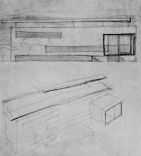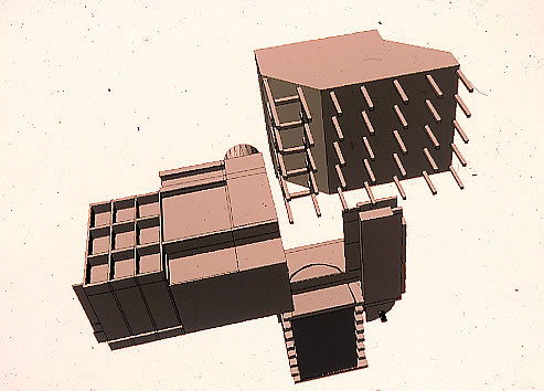 ...Il vuoto centrale si rivela come il negativo del solido entro cui è ricavato, come se volume pieno e vuoto interno facessero parte di uno stesso mondo e si richiedessero anche nell'uso del telaio strutturale a vista l'uno con l'altro .p. 44 , e con la riucitura del telaio nell'ultima campata). p.45