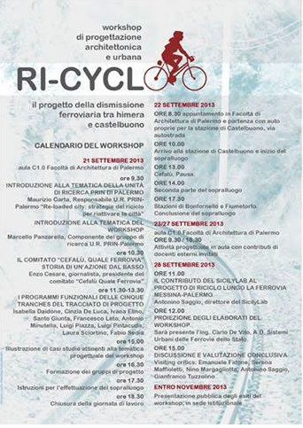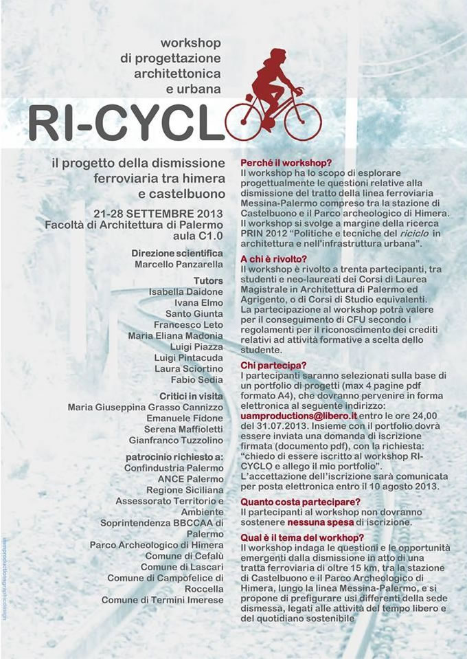 Si è concluso ieri molto positivamente il workshop RI-CYCLO, tenutosi dal 21 al 28 ottobre presso la facoltà di architettura di Palermo. I risultati di otto giorni di indagine e progetto sul riuso della linea ferroviaria in dismissione tra le stazioni di Castelbuono e Fiumetorto sono stati presentati ad alcuni docenti intervenuti in veste di critici: Andrea Sciascia - Unipa, Antonino Saggio - Roma La Sapienza, Emanuele Fidone - Unict/SR, Gianfranco Tuzzolino - Unipa, Antonino Margagliotta - Unipa, Gero Marzullo - Unikore/EN. Inoltre sono intervenuti l'ing. Carlo De Vito, AD della Società "Sistemi Urbani" delle FS, e il giornalista Enzo Cesare, presidente del comitato "Cefalù quale ferrovia", i quali tutti hanno fornito osservazioni, critiche e apprezzamenti che saranno molto utili per la continuazione del lavoro. L'appuntamento è a fine novembre, per la presentazione pubblica alle istituzioni e agli enti locali interessati delle proposte elaborate nel workshop.