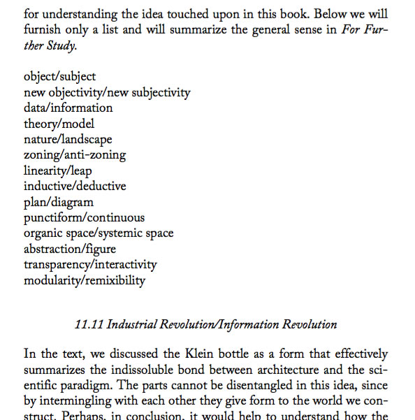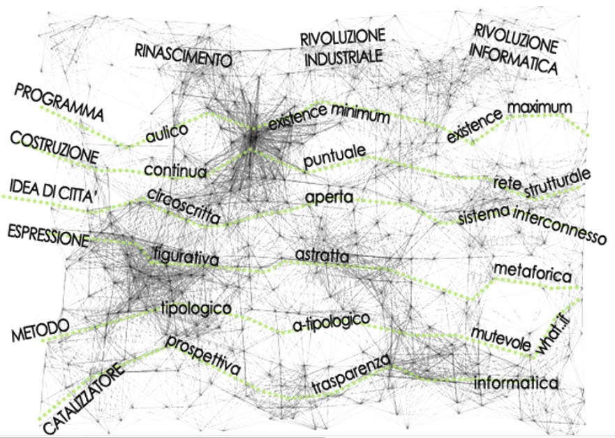 – oggetto/soggetto; – nuova oggettività/nuova soggettività; – dato/informazione; – teoria/modello; – natura/paesaggio; – zoning/antizoning; – linearità/salto; – induttivo/deduttivo; – schema/diagramma; – puntiforme/continuo; – spazio organo/spazio sistema; – astrazione/figura; – trasparenza/interattività; – modularità/rimixabilit.
