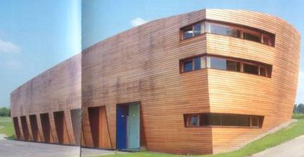 E’ un’evocazione dovuta alla forma organico astratta di questo showroom-deposito per legno; un progetto un po’ datato di Baumschlager&Eberl che si pone, un po’ come il museo del mare di Piano ad Amsterdam, in un periodo di trasizione tra ciò che è meramente funzionale e la forma rappresentativa di un luogo o di una comunità. Esso presenta un sistema organizzativo più vicino ad un' edilizia industriale che a una forma libera, funzionale allo scopo cui è preposta ma già elabora delle soluzioni, anche se ancora solo epidermiche,  di "pubblicizzazione" di se stessa; mostra nelle rifiniture esterne quella precisione del lavoro artigianale, allusione alle tecniche manuali locali, che si offre come servizio in questo edificio, fungendo così come qualcosa di più di un particolare puramente decorativo.