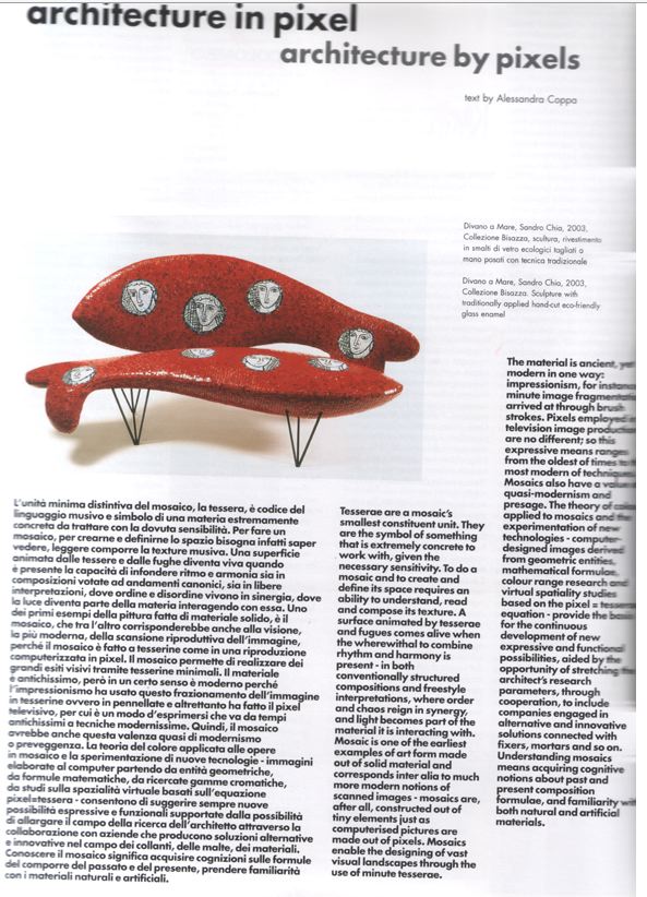 Ho trovato questo interessante articolo su come la teoria del colore applicata alle opere in mosaico e la sprimentazione di nuove tecnologie-immagini elaborate al computer partendo da entità geometriche, da formula matematiche, da ricercate gamme cromatiche, da studi sulla spazialità virtuale basati sull'equazione pixel = tessera, consentano di suggerire sempre nuove possibilità espressive e funzionali supportate dalla possibilità di allargare il campo della ricerca dell'architetto.
