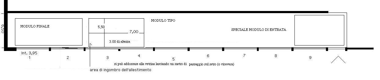 Il modulo è posto secondo lo schema A attaccato alla vetrina esterna, lasciando quindi un passaggio di un metro libero sul retro, oppure scostato e con il passaggio davanti sulla vetrina.