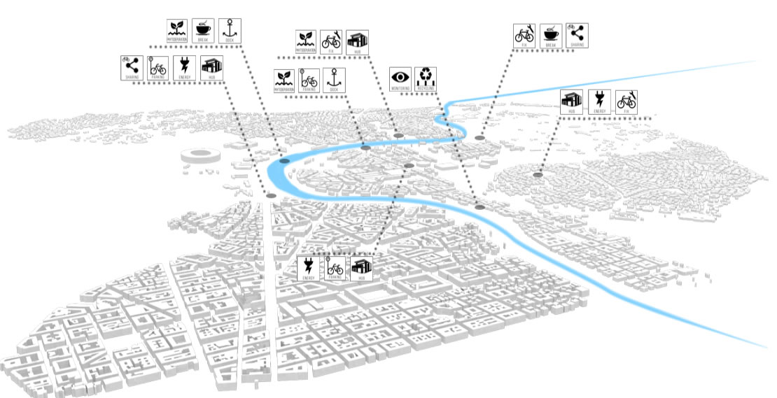Nell'ambito di una strategia di sviluppo il Tevere può recuperare la dimensione di grande infrastruttura urbana che gli spetta riscattando la propria immagine. Due sono le strategie che a.r.c.h. segue: la prima, progettuale, propone una rete di stazioni fluviali con spazi per la custodia e lo sharing di mezzi di trasporto pubblici e privati a impatto zero, un sistema in grado di rigenerare gli spazi residuali, la seconda, di tipo economico, intende garantire una migliore gestione e trasparenza amministrativa, attraverso l'uso di app legate all'economia di sharing che investe l'immenso campo di potenzialità aperto dallo sviluppo esponenziale di internet.