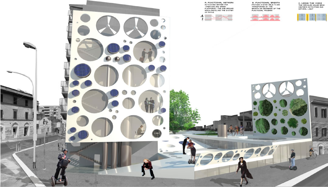 F5. FOTOMONTAGGIO del progetto nell'area di URBAN VOIDS realizzato con grande cura. Disegno chiave fondamentale dell'intera presentazione.