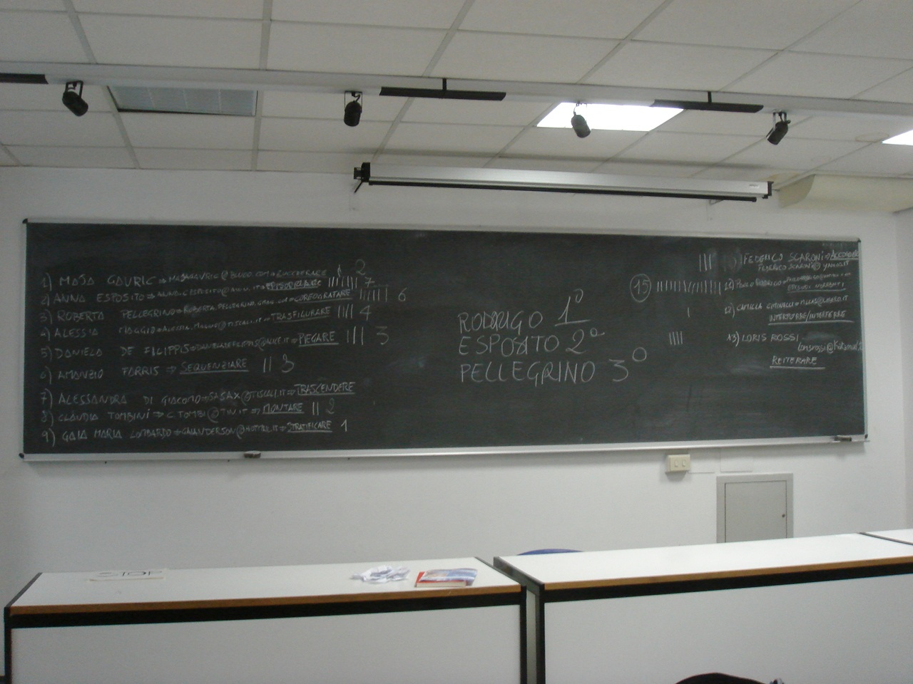 Le 14 presentazioni hanno avuto un grande successo destando vivo interesse, ciascun partecipante ha espresso un voto di preferenza. Al primo posto è risulatto Paolo Rodrigo presentazione 12 (Episodi narranti), e al secondo posto ex aequo Anna Esposito (presentazione 2 Epiosodizzare) e Roberta Pellegrino presentazione 4 ( Coreografare). La grande distribuzione dei voti tra tutte le presentazioni dimostra la qualità del lavoro complessivo. >> Gli studenti del corso UE hanno facoltà di chiedere approfondimenti e delucidazioni agli architetti dottorandi tramite email.