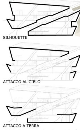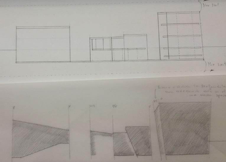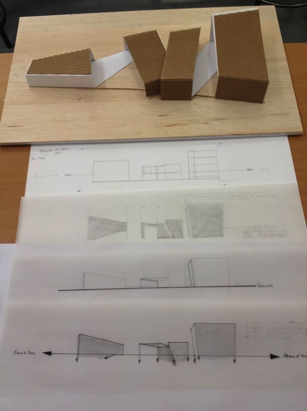 F3. Iniziare a fare a vostra scelta una serie di disegni inziando dalla caratteristica che secondo voi è più importante del progetto. per esempio Silhouette? o Chiaroscuro? o. Attacco al suolo? o Attacco al cielo o Ritmo? Per "vedere" il progetto è utile ovviamente a volte guardare il modello 3d se lo avete nel computer o ancora meglio il plastico se lo avete cominciato a fare. Adesso in qualche modo "interrogato2 il plastico più che dal punto di vista spaziale..da quello espressivo!